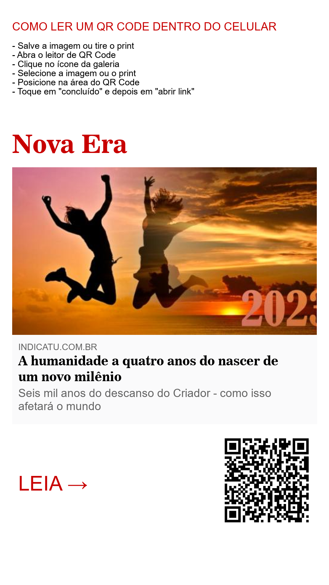 Em 2023, completa-se o ciclo de 6 mil anos do descanso do Criador desde sua última criação, Eva. Isto afetará de forma direta todo indivíduo vivo atualmente e significará o fim de toda forma de governo liderado pelo homem. Este traz em seu bojo um histórico de fracasso, angústia, opressão e todo tipo de sofrimento que parece não ter fim, mas, para o nosso alívio, apenas ‘parece’, porque os dias desses governos foram contados e estão à beira do seu limite final. Será o fim da iniquidade em todo o corpo social que abrange os maiores pilares que sustentam toda uma vidraça de ilusões, a saber, o sistema político, comercial e religioso, construídos com o propósito de iludir e desvirar o foco dos ocupantes desta esteira rolante que conduz o mundo para o precipício que se esconde atrás dela.