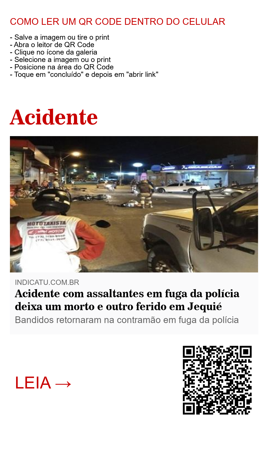 Segue as informações de que dois meliantes, após efetuarem um assalto em um dos bairros da cidade nesta noite de Segunda-Feira (02), trafegavam em alta velocidade em uma motocicleta, quando, ao avistarem uma guarnição da polícia militar, retornaram na contramão pela movimentada avenida Landufo Caribé e colidiram de frente com outra motocicleta no cruzamento próximo a uma distribuidora de gás. No acidente, um dos indivíduos veio a óbito no local. Seu comparsa ficou gravemente ferido, sendo socorrido e levado com vida para o Hospital Geral Prado Valadares em Jequié.