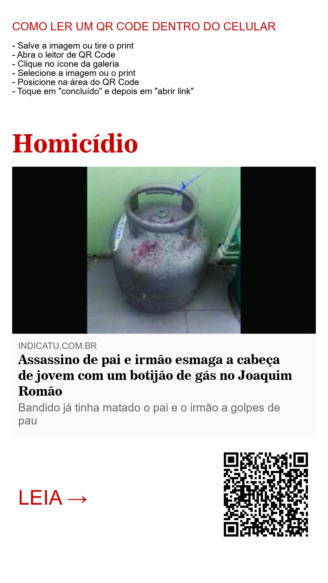 Segue as informações de que por volta das 12h: 20 minutos desta quarta-feira 03, Ivanildo Santos de Andrade, vugo Juvenal, assassinou com um botijão de gás o jovem Felipe, de 27 anos, nas proximidades do colégio Aurino Neri no loteamento do Sol Nascente, bairro Joaquim Romão em Jequié.