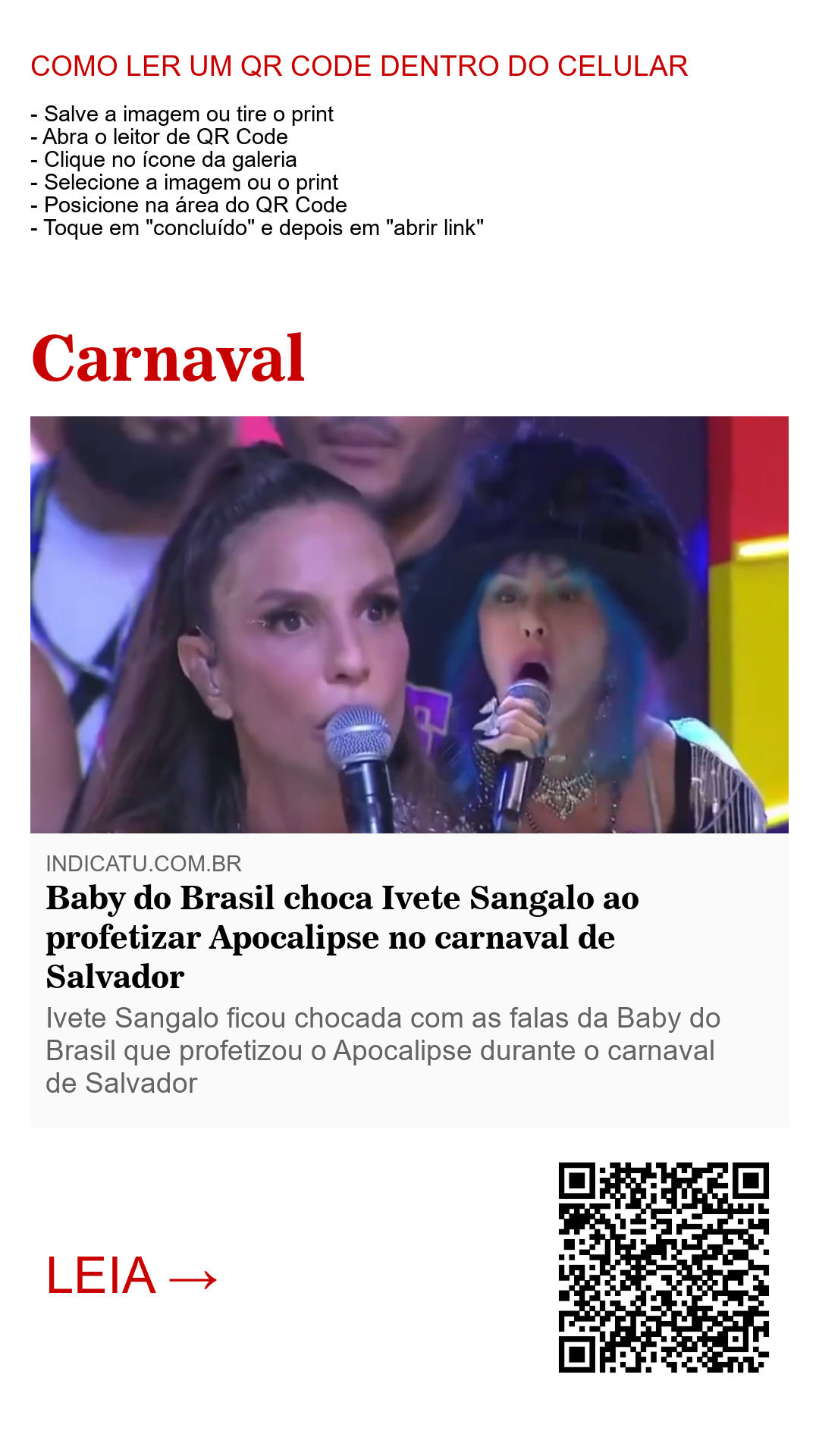 A cantora Baby do Brasil chocou Ivete Sangalo durante sua breve aparição no circuito da folia no carnaval em Salvador ao profetizar que o Apocalipse vai acontecer em dentro de 5 a 10 anos. A cantora Ivete ficou pasma e não conseguiu esconder o choque que levou com as falas da artista. Ivete foi pega de surpresa porque, pelo visto, não esperava aquilo por vários motivos óbvios, sendo um deles uma pregação bíblica em uma festa mundana regada a diversos tipos de pecados dos mais profanos possíveis praticados tanto à noite quanto à luz do dia em via pública. O choque da Ivete é justificável porque ela foi pega de surpresa.