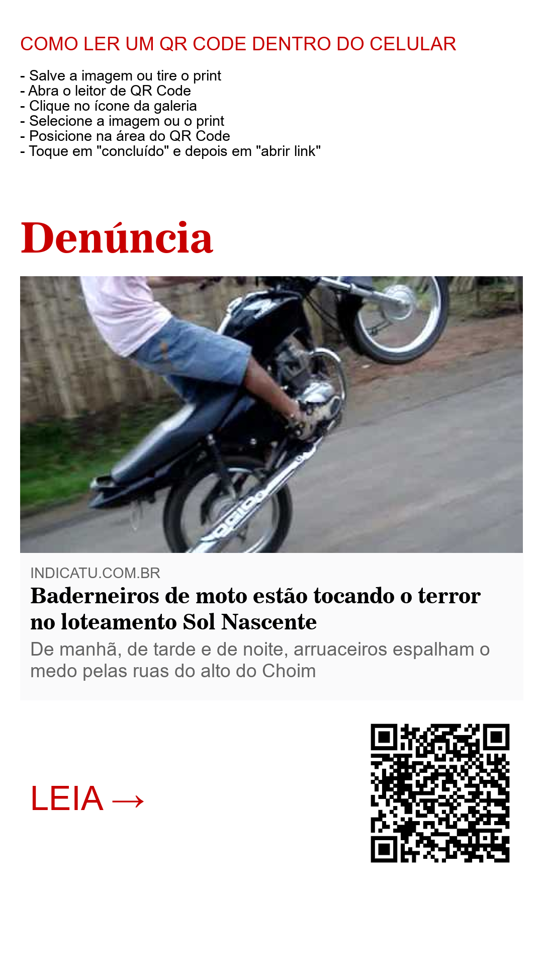 Os moradores do loteamento Sol Nascente, no bairro Joaquim Romão, estão pedindo socorro às autoridades para dar um basta à ousadia flagrante de motociclistas arruaceiros que estão perturbando a paz e o sossego da comunidade. “Não tem dia nem hora. A todo momento é um empinando moto, tocando a descarga... é um verdadeiro inferno. O bairro que era sossegado perdeu a paz”, disse um morador insatisfeito com a situação. “Já denunciei à polícia militar e a pessoa que atendeu disse que se continuasse assim que era pra ligar de novo. Isso foi há 4 meses atrás”, contou outro morador que não quis se identificar.