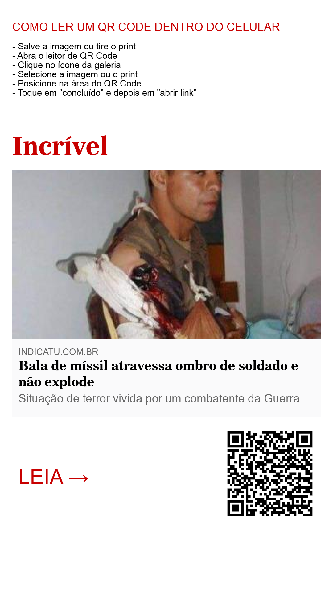 Uma cena de causar espanto tem viralizado nas redes sociais. Um soldado levou um tiro de míssil que lhe atravessou o braço e o ombro direito. A bala ficou encrustrada na carne, e o mais surpreendente, o projétil de grande porte não explodiu com o impacto. Apesar da situação para lá de incomum e bizarra, o homem, ou melhor, o soldado combatente não esboçou medo mesmo depois de ter ciência da gravidade da situação à qual estava submetido.