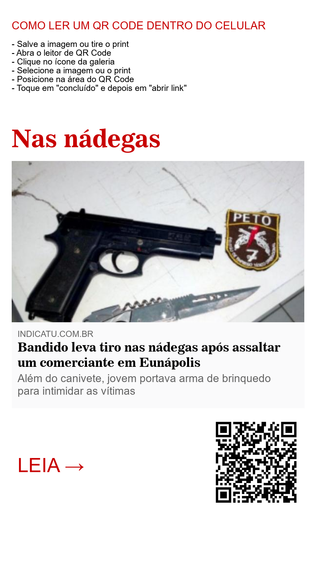 Um jovem de 23 anos de idade foi alvejado com um tiro nas nádegas e posteriormente contido pela polícia após esfaquear na altura do peito, com um canivete, um comerciante em pleno centro de Eunápolis, extremo sul da Bahia. O crime aconteceu agora na virada do mês (31) às 23:00h .Para a sorte do comerciante uma guarnição do PETO (Pelotão de Emprego Tático Operacional) ia passando no exato momento do crime enquanto realizava rondas na localidade.