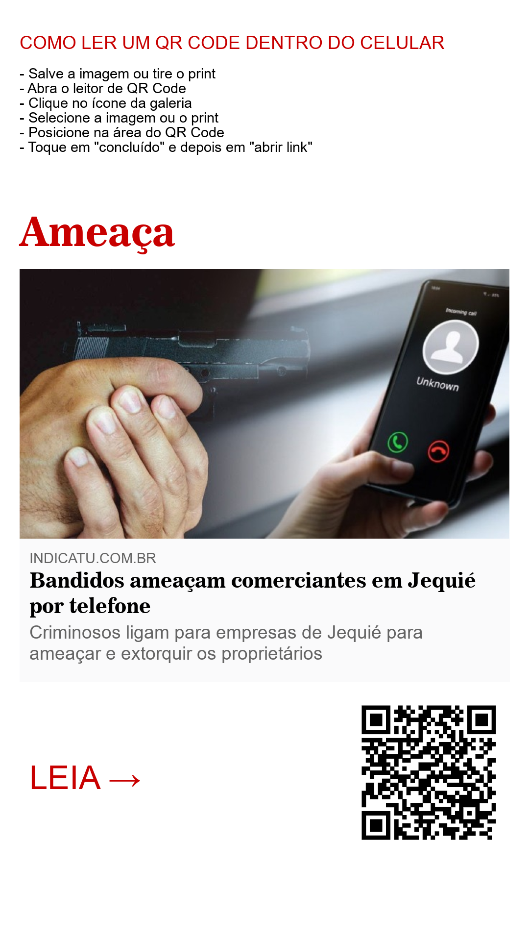 Bandidos ameaçam empresários na cidade de Jequié por meio de ligações telefônicas. Segundo denúncias dos próprios comerciantes, os criminosos estão utilizando a tática da ameaça e coação para extorquir dinheiro dos empresários via PIX. O caso tem circulado nas redes sociais de repórteres locais com a descrição do ato criminoso que consiste em ameaças de morte dos comerciantes em seu local de trabalho. Entenda o caso.