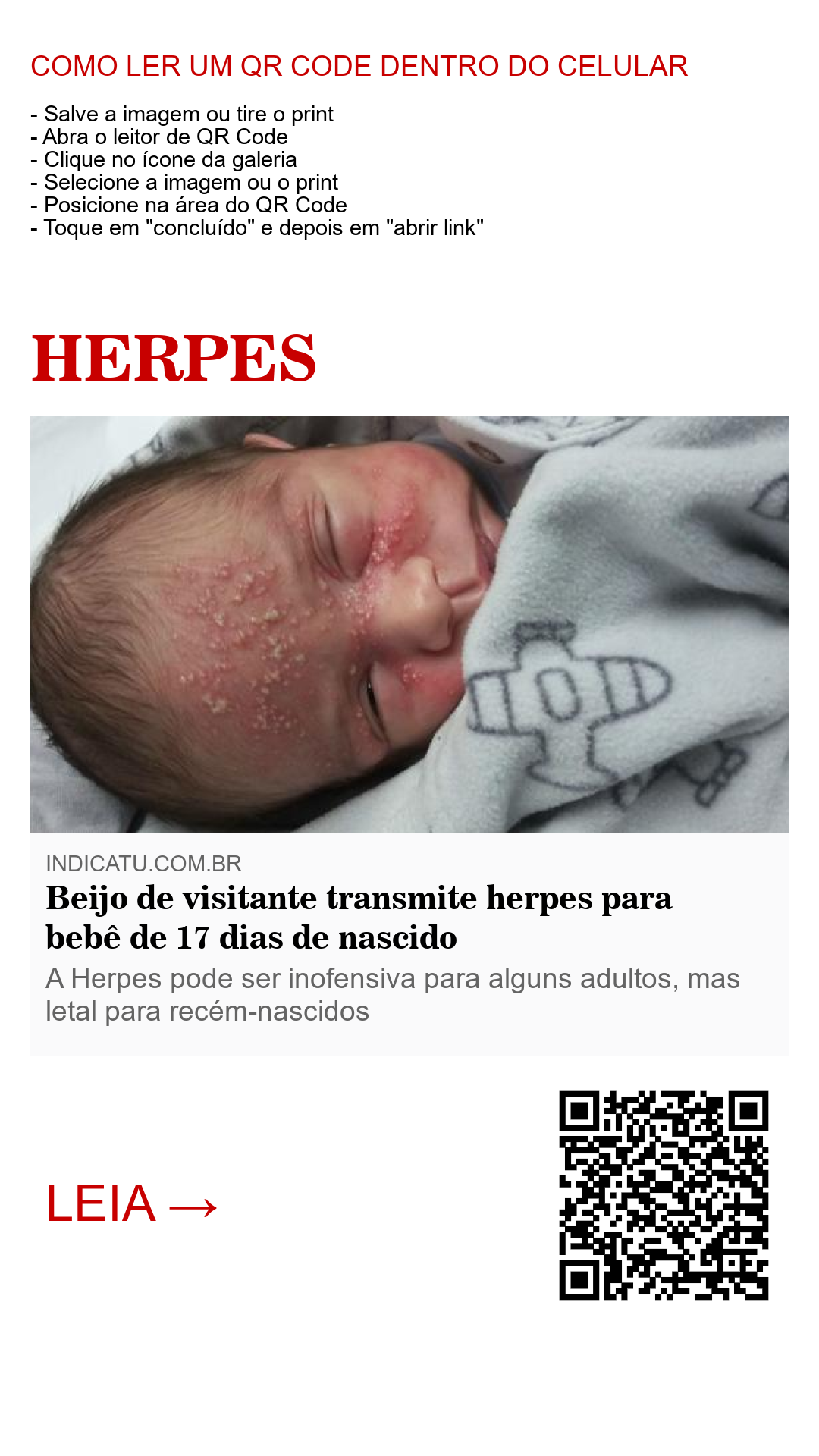 O caso aconteceu em São Paulo com o Gustavo, filho da manicure Rafaela Moreira. A criança de apenas 17 dias de nascido passou por uma situação desagradável após receber beijos de pessoas que o visitaram em casa. Segundo informou a mãe da criança ao site ‘bebemamae’, a doença não apresentou sintomas no bebê e o contágio ocorreu do dia para a noite. “Não teve sintoma nenhum no caso do Gustavo, ele não teve nada, simplesmente ele amanheceu com o rostinho daquele jeito, foi do dia para noite!”, contou Rafaela.