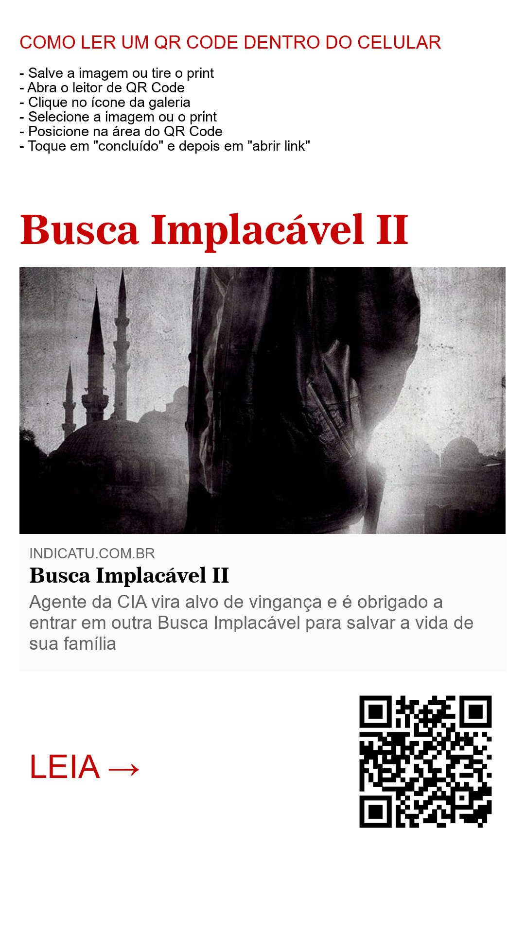 Quando tudo parecia estar em harmonia na vida do agente da CIA, Bryan Mills (Liam Neeson), a lei do retorno o confronta com as consequências de suas ações passadas. O vingador em questão é o pai de Marco de Tropoja, que busca reaver a honra familiar. Com uma filosofia que se baseia na retribuição — "alma por alma e dente por dente" —, a trama se desenrola em um contexto de vingança. Busca Implacável II foi lançado em 2007 e obteve um expressivo sucesso nas bilheteiras, arrecadando cerca de 376,1 milhões de dólares, superando o desempenho do primeiro filme, que, embora inferior, ainda é considerado mais impactante.