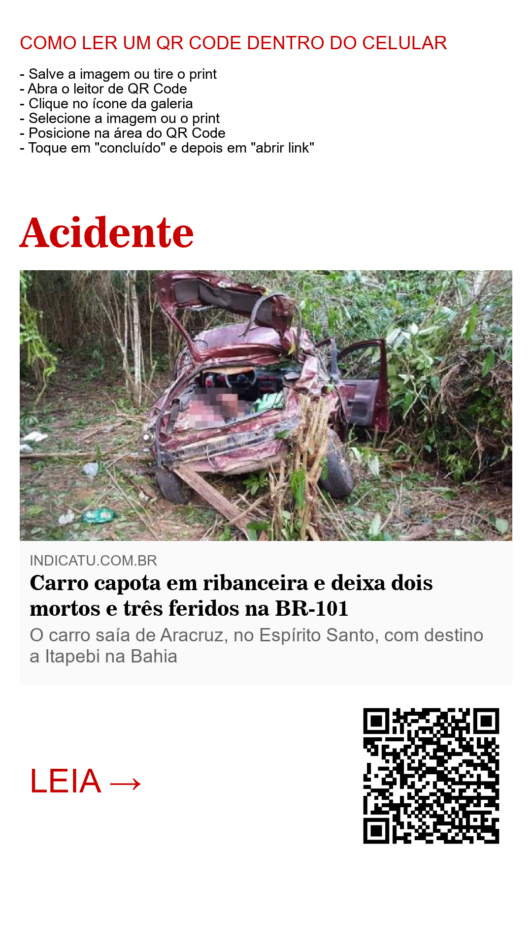 Um grave acidente envolvendo um veículo Chevrolet Corsa de cor vinho, nas alturas do quilômetro 889 da br-101, próximo ao município de Teixeira de Freitas, deixou duas vítimas fatais e três feridos, nesta tarde de sexta-feira (29). O veículo saiu de Aracruz, no Espírito Santo, com destino a Itapebi-BA. As causas frequentes de mortes na cidade estão relacionadas com o alto número de homicidios e acidentes graves.