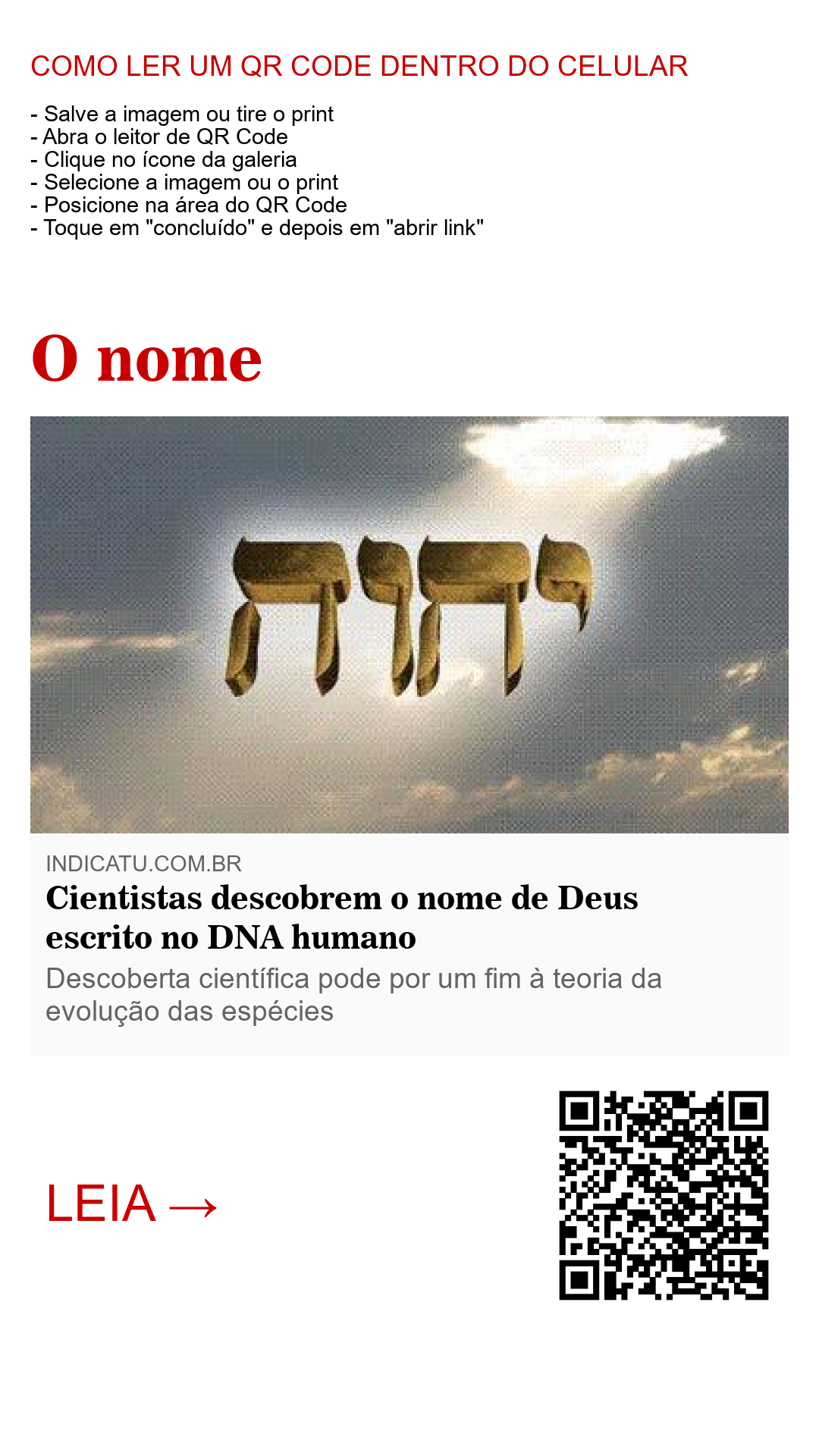 Acontece que o nosso DNA segue um padrão 'ligado por pontes' que se alternam da seguinte forma: 10 5 6 5.No hebráico, idioma original da escrita do nome de Deus, cada letra do alfabeto equivale a um número. Curiosamente, as quatro consoantes hebráicas ( יחוח ), conhecidas como tetragrama, escritas da direita para a esquerda, formando o nome divino, ocupam posições numéricas do alfabéto equivalentes ao padrão de alternância do nosso DNA. Veja: Yud(10) - Hay(5) - Vav(6) - Hay(5).Essas letras hebraicas, quando transliteradas para o Português, ganham a forma de: YHWH ou YHVH. Para dar sentido ao nome em português, usa-se vogais e consoantes, as letras que mais se assemelham ao som original do nome. São elas: J - E - O - V - A ou JEOVÁ. Fascinante, não é?