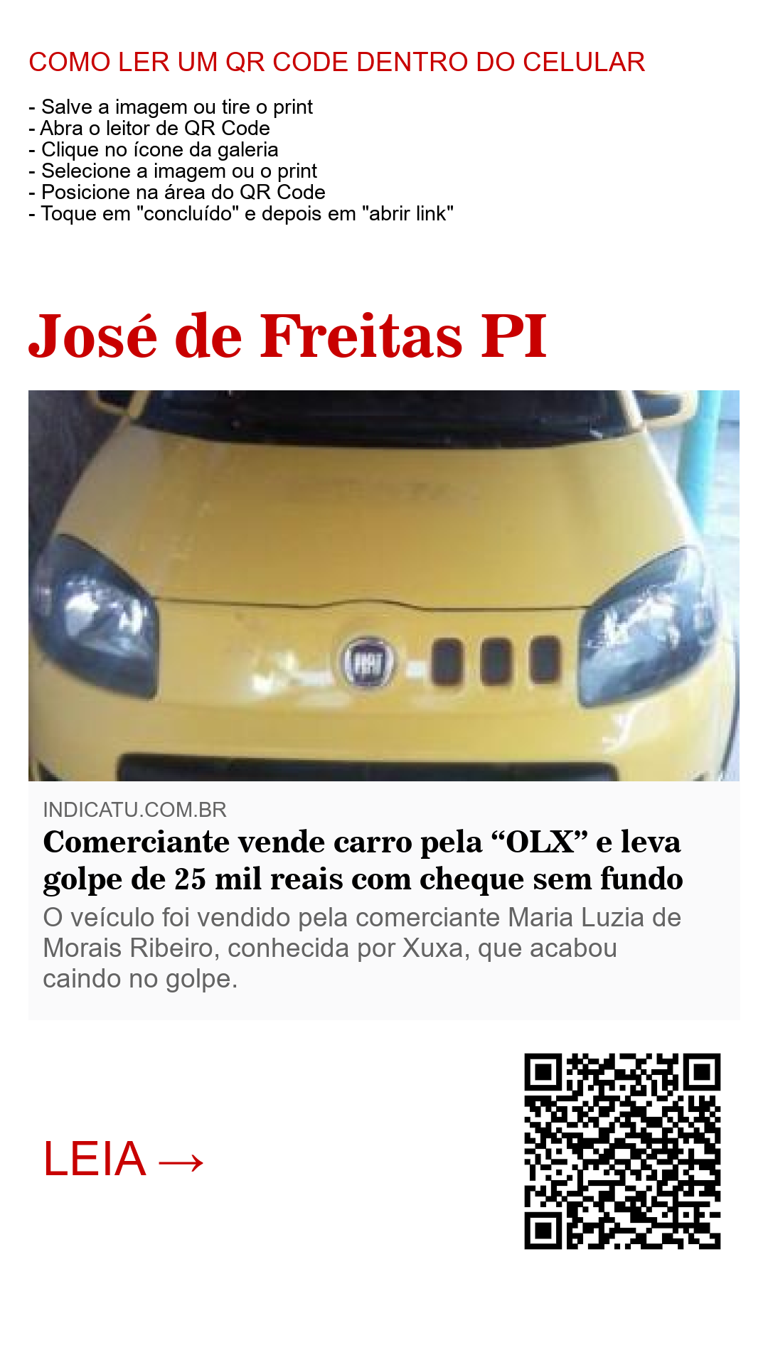 Após a negociação do seu carro, por volta das 13h30min do dia 17 de novembro, a comerciante Xuxa e o estelionatário que tem aproximadamente 30 anos e estava usando óculos escuros e boné, foram até a casa lotérica Sorte Grande, na avenida Tabelião Marcelino Sampaio, no Centro de José de Freitas, onde teria sido conferido através de um extrato que o dinheiro da venda do carro havia sido depositado na agência da Caixa Econômica Federal do Bairro Parque Piauí, na Zona Sul de Teresina.
