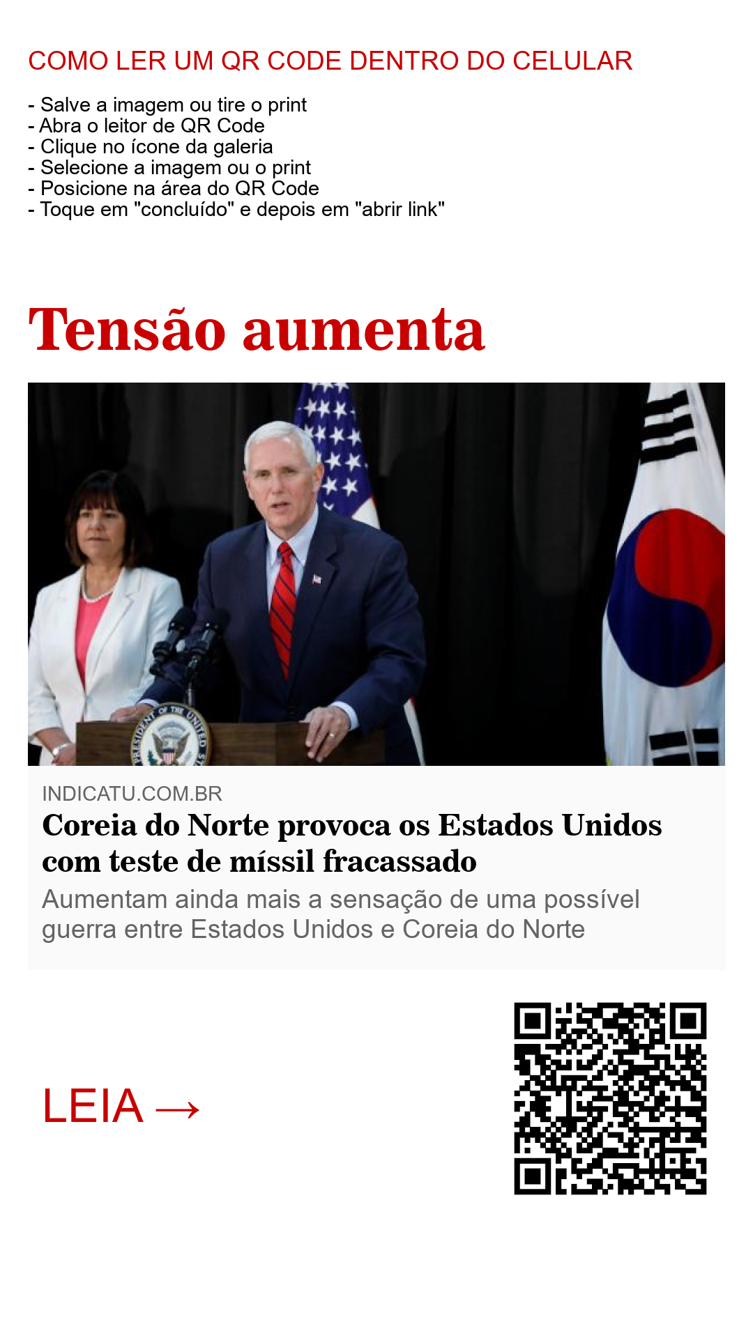 O vice presidente dos Estados Unidos classificou como “uma provocação” o teste de um míssil fracassado feito pela Coreia do Norte neste fim de semana. Num jantar do Domingo de páscoa, na base militar americana em Yongsan, capital Sul-Coreana, o vice presidente disse a um grupo de militares: “A provocação desta manhã no Norte é simplesmente o último lembrete dos riscos para cada um de vocês cada dia”.