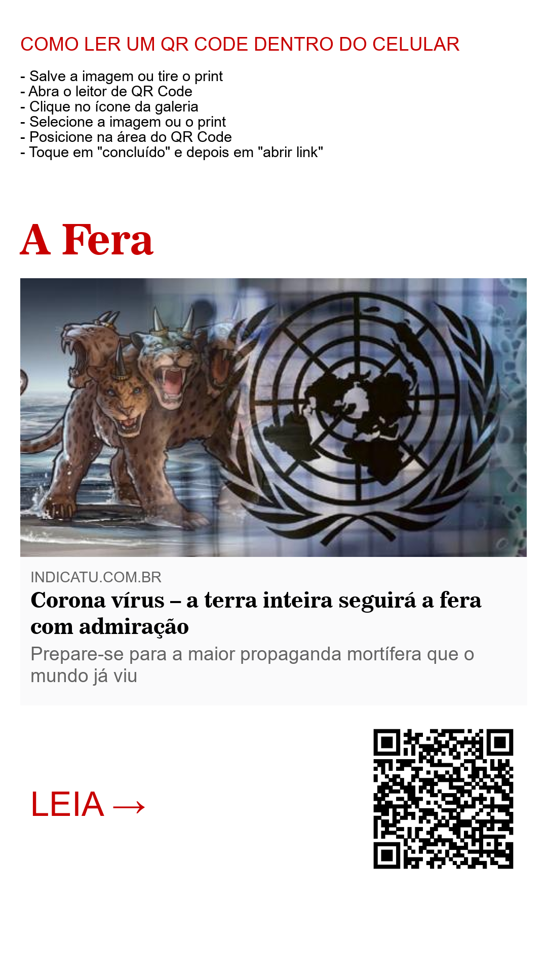 Só há um jeito de a FERA conseguir a admiração do mundo: anular todos os efeitos psicológicos, emocionais e, principalmente, financeiros, da população mundial, através de projetos sociais de alcance global que favoreçam a segurança física e, principalmente financeira, dos povos, para este momento de crise específico. E como o fazer? Para ganhar a confiança e massagear o ego inflamado de bilhões de afetados por essa balbúrdia mundial, a ONU, ou seja, a FERA, vai dar um jeito de soltar dinheiro no bolso do povo para ganhar o seu favor e admiração. Além do que, é ano de eleição nos Estados Unidos e, não haveria ambiente melhor para alavancar a popularidade de líderes políticos que queiram se aproveitar da situação e lançar a si mesmo com a insígnia de “salvador do mundo” na sombra da fera. Enquanto isso, anestesiados pelo frenesi dessa época de engano descomedido, todos os povos sob a influência da FERA desconhecerão o fato de estarem caminhando para o profundo e escuro abismo mortífero de inatividade eterna que sugará para dentro de si as almas dos bilhões de desafortunados que se negaram a dar crédito aos avisos que visavam a salvação de suas vidas.