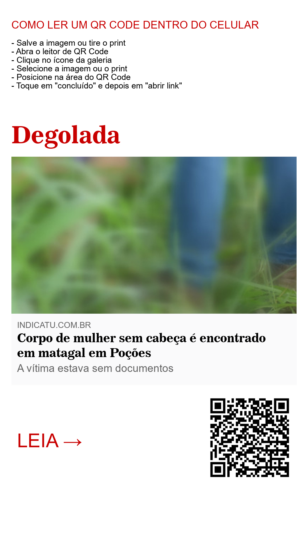 Segundo informações de jornais locais, o corpo da vítima foi encontrado sem a cabeça e com sinais de perfurações de faca, o que levou a perícia a concluir que a mesma foi morta a facadas antes de ser degolada, tendo seu corpo posteriormente lançado em um matagal da região. A vítima foi encontrada sem documentos e a polícia civil segue nas investigações do crime. O corpo foi encaminhado para o Instituto Médico Legal e aguarda a identificação dos familiares.