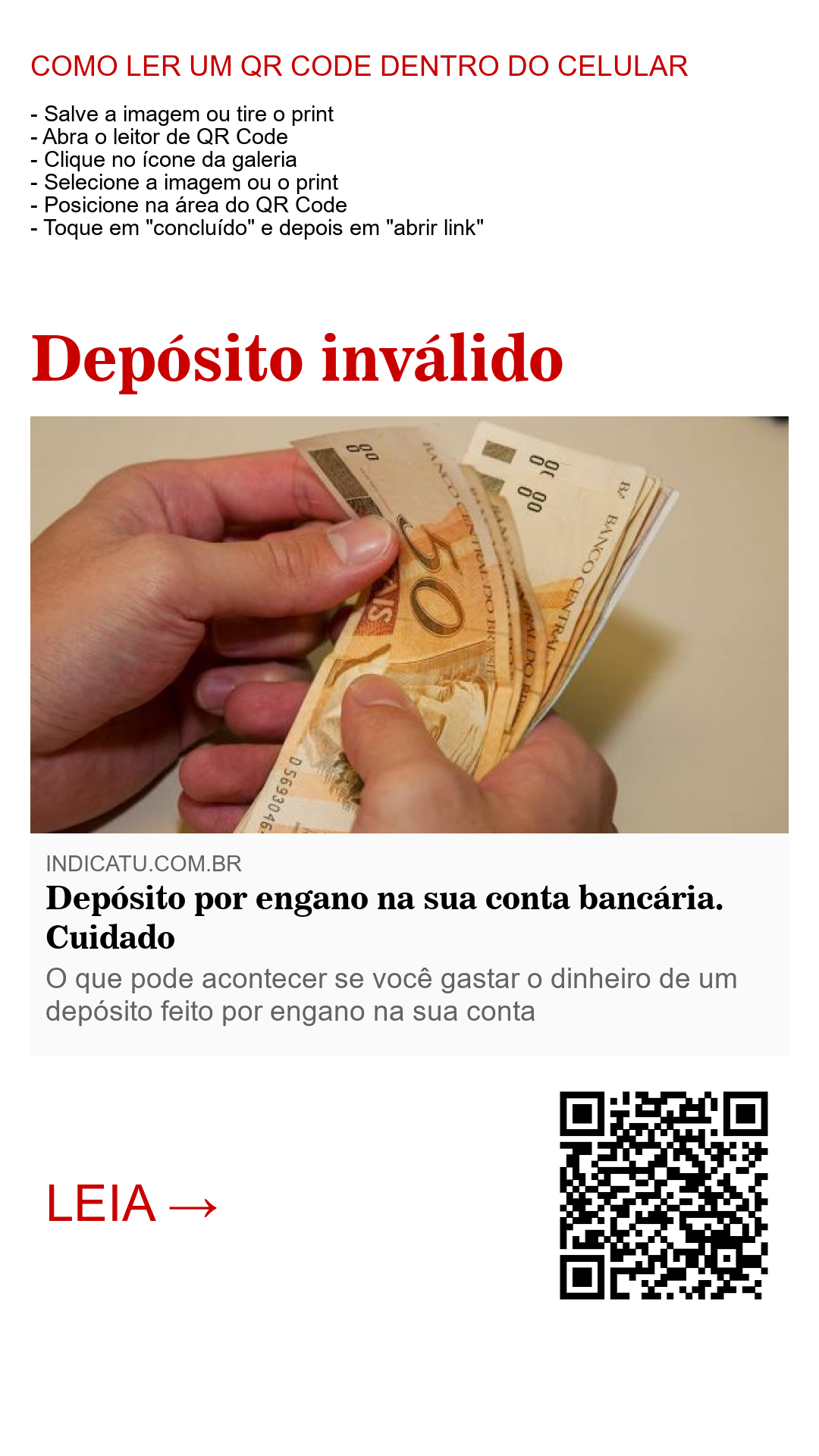 Se você recebeu um depósito por engano em sua conta bancária, cuidado, e fique atento. Gastar dinheiro da fonte citada pode enquadrar você no artigo 168 do código penal, “apropriar-se de coisa alheia móvel, de que tem a posse ou a detenção”. A prática deste crime é tipificada como “Apropriação indébita”, sendo sua pena a prisão de 1 a 4 anos de cadeia ou multa. E não é só isso, o bom nome que você lutou para construir durante anos pode ser manchado para sempre, entre um minuto e outro, na frente de um caixa eletrônico.
