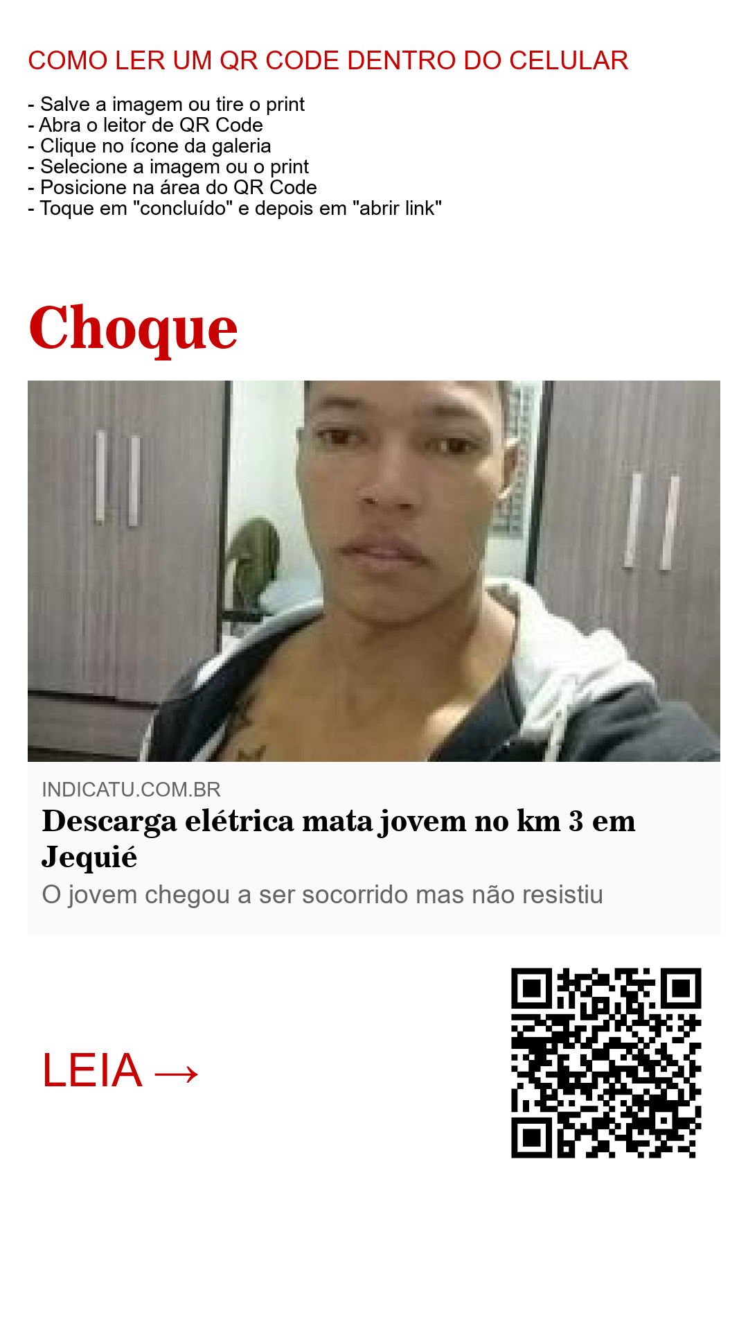 Jequié, 09 de dezembro - Segundo informações passadas à nossa redação por WhatsApp, o jovem de prenome Diego sofreu uma forte descarga elétrica no bairro do km- 3 agora pela tarde, neste sábado, (09).