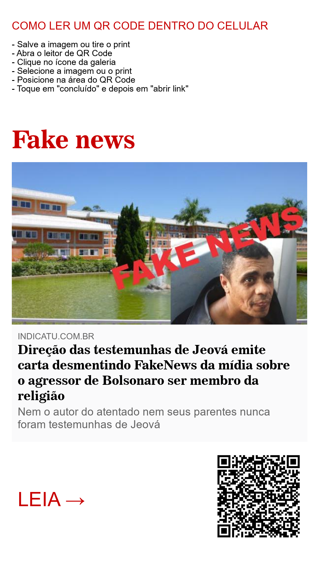 A filial das testemunhas de Jeová no Brasil, localizada em Cesário Lange, São Paulo, emitiu neste fim de semana cartas para as mais de 11 mil congregações no país desmentindo a falsa notícia que circulou em vários jornais ditos sérios e de grande circulação no país com a informação de que o agressor da "facada" dada no candidato à presidência, Jair Bolsonaro, no último dia 06, por volta das 14h na cidade de Juiz de fora, Minas Gerais, era membro da religião.