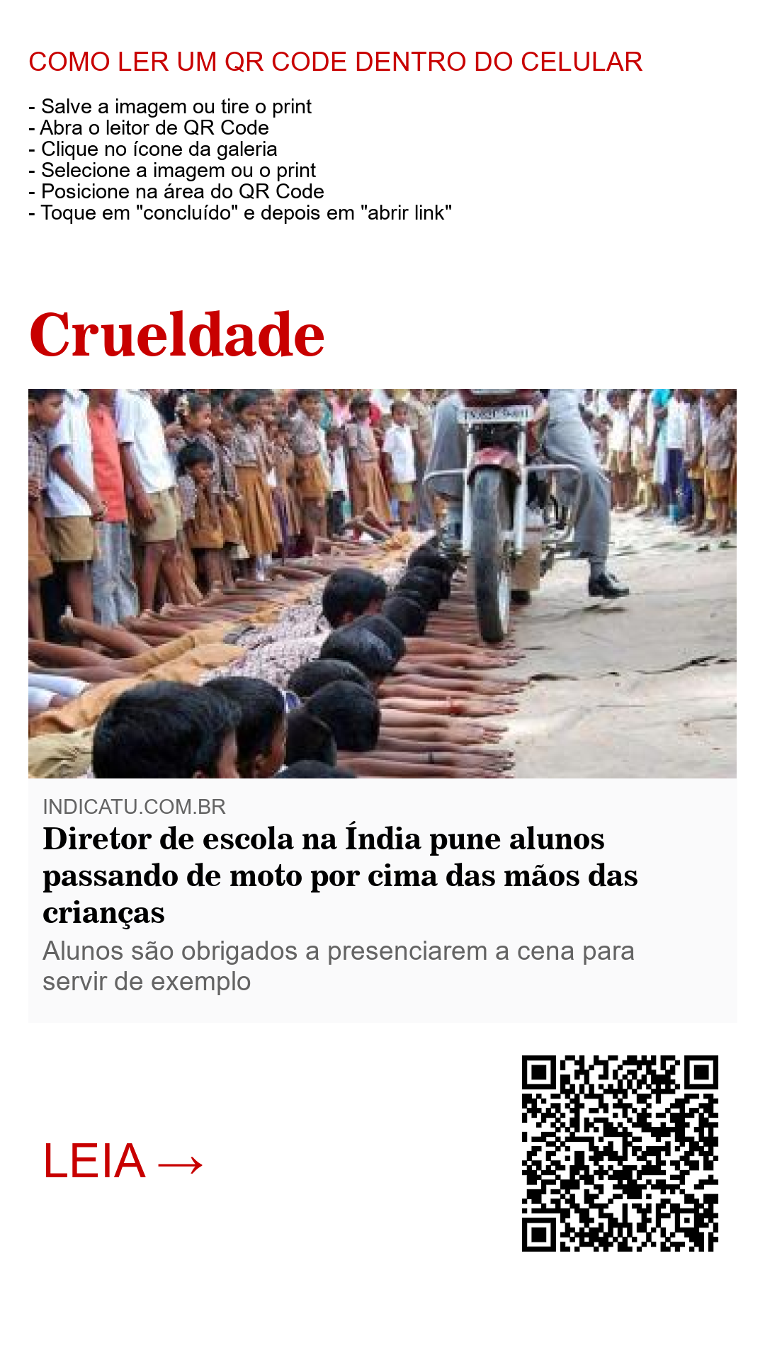O diretor de uma escola na Índia adotou como forma de punição aos alunos que chegam atrasado para as aulas, terem suas mãos esmagadas pelas rodas da motocicleta pilotada por ele sob os olhares de outras crianças, que também são alunas da escola, como forma de exemplo para não incorrerem na mesma falta. As informações para este caso são escassas, tendo como fonte apenas uma fotografia e pouquíssimos detalhes. A imagem circula pelas redes sociais e tem gerado muitas manifestações e revolta contra a atitude covarde adotada pelo educador.