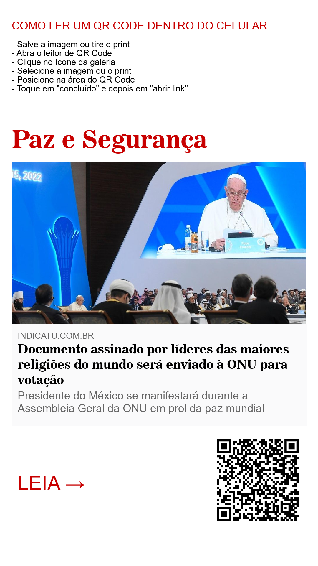 Um documento assinado pelo Papa Francisco e outros líderes das maiores religiões do mundo será enviado à ONU para ser votado. O teor do documento é fruto dos trabalhos religiosos discursados em Astana, Cazaquistão, de 13 a 15 de setembro deste ano, 2022, no VII Congresso de Líderes de Religiões Mundiais e Tradicionais. O evento também passou a ser chamado de “um novo movimento global para a paz”, que foi uma das frases que o presidente do Cazaquistão Kassym-Jomart Tokayev usou em seu discurso de abertura do evento e que, por sua vez, foi bem recebida pelos líderes religiosos que compunham a cúpula. A palavra paz foi a que mais se ouviu em todos os discursos durante os três dias de evento.
