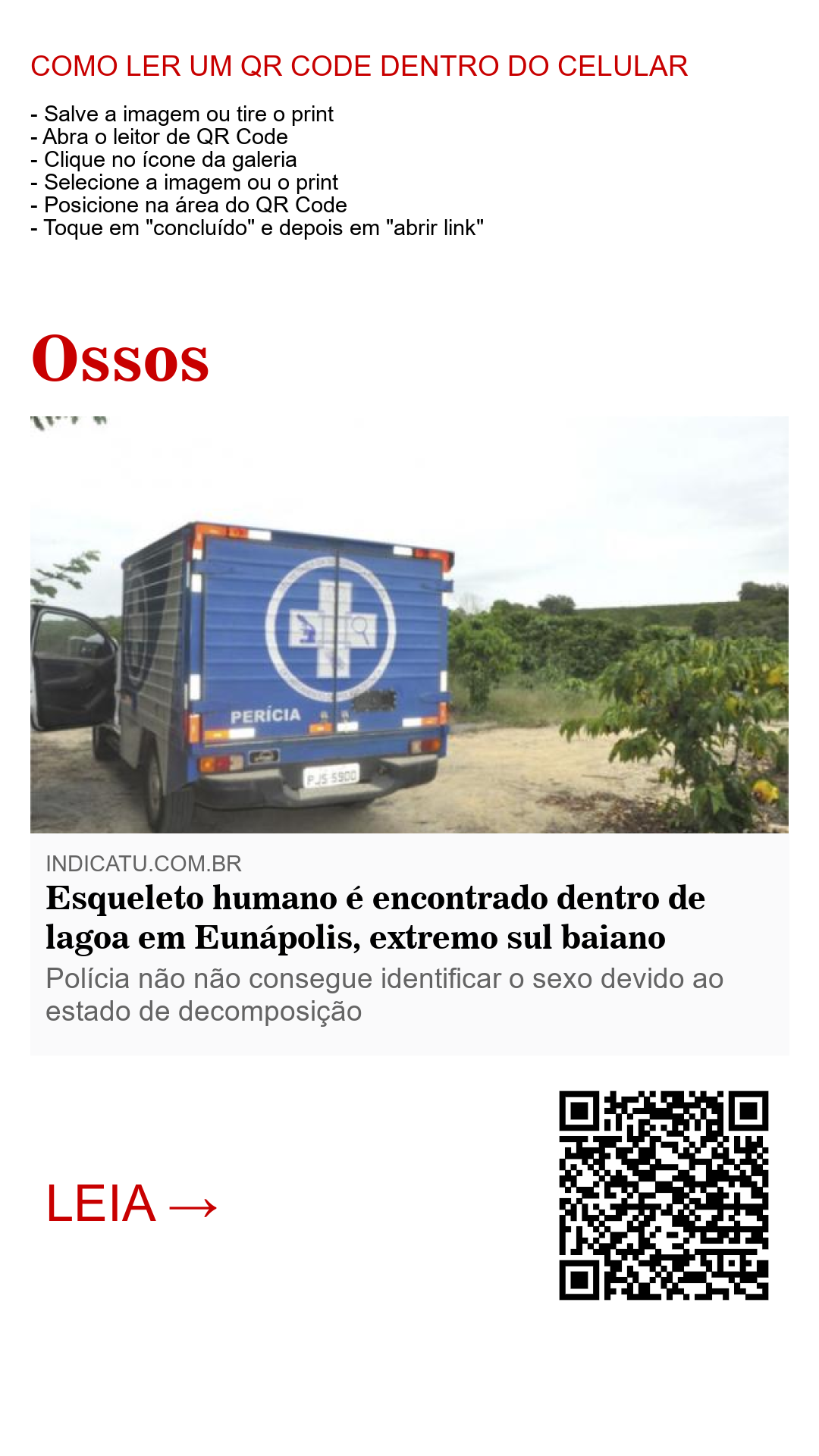 Um esqueleto humano foi encontrado dentro de uma lagoa ao cair da tarde desta quinta-feira (03), na zona rural da cidade e Eunápolis, extremo sul baiano.