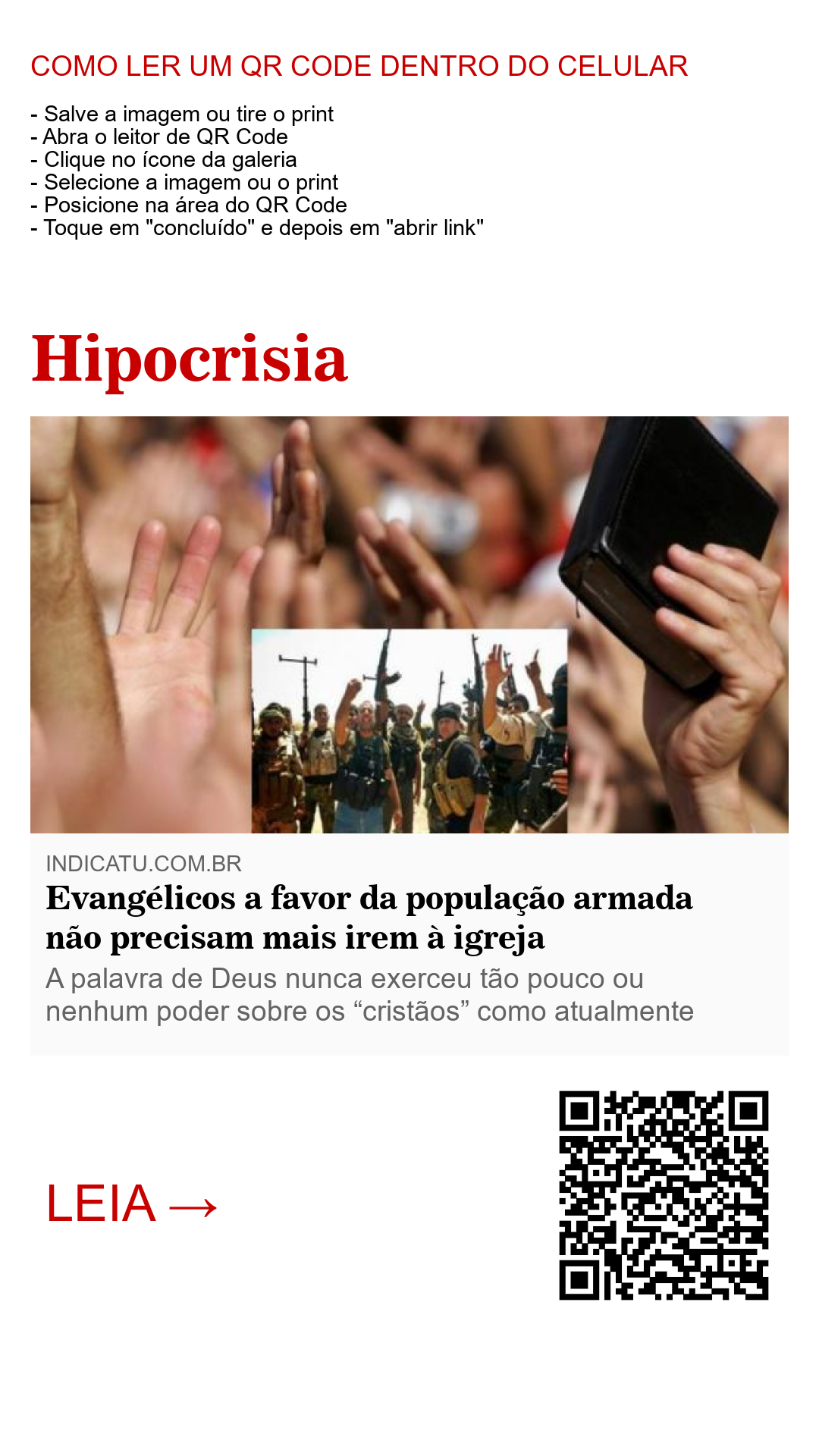 Na contramão de todos os princípios das sagradas escrituras, milhões de evangélicos manifestaram seu apoio à população armada ao apoiarem Bolsonaro para presidente que, após a grande repercussão da fala desrespeitosa, racista e feroz usada pelo candidato em ofensas pessoais, camuflou o tom do seu discurso dispensado a mulheres, nordestinos, pobres e etnias estigmatizadas da sociedade, para cair na “graça” dos mesmos.