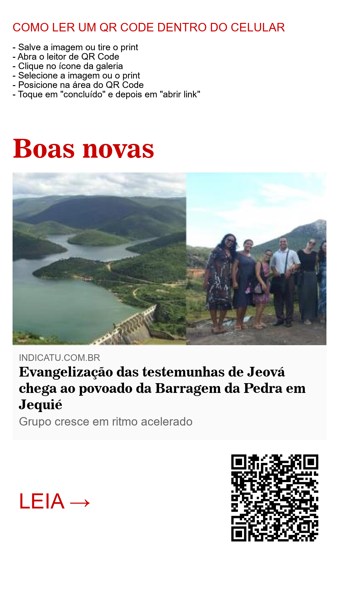 O pequeno grupo que visita o povoado da Barragem da Pedra acabou de ser formado. Com o crescimento da congregação Oeste – unidade encarregada das visitas ao território –, o grupo foi dividido para ser formada a congregação do “Curral Novo”, que é um bairro próximo ao vilarejo e que também já está crescendo em ritmo acelerado. Em breve, um novo salão do reino será construído para acomodar a nova congregação, na modalidade de Construção Rápida, o 5º nessa modalidade no município de Jequié. A previsão é que o prédio seja erguido e pronto para uso em apenas 30 dias. Um mutirão de voluntários da cidade e de cidades circunvizinhas está sendo formado e apoiadores de várias idades já estão fazendo preparativos para dá uma força ao serviço de voluntários.