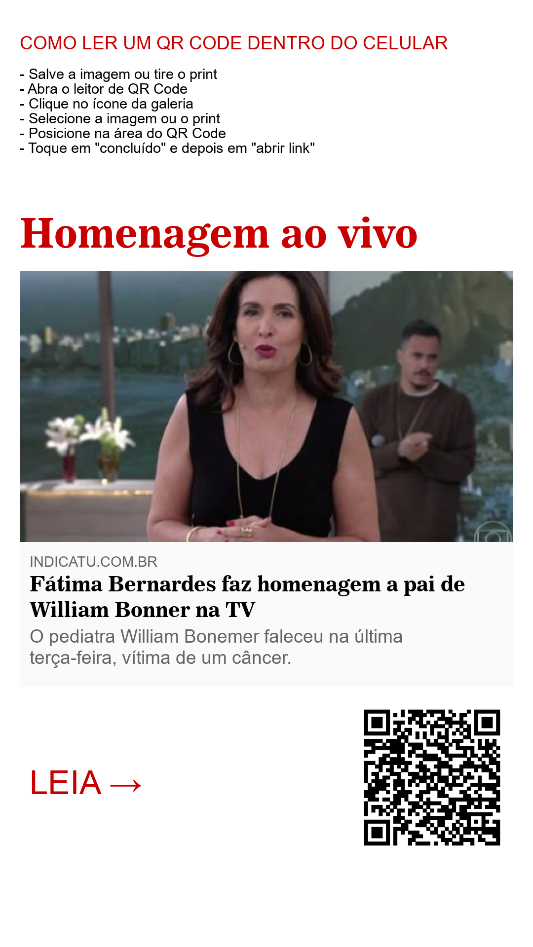 “Eu começo o programa de hoje agradecendo aos meus parceiros Cissa, Lair e Felipe Andreoli. Somente com o apoio deles eu pude me despedir do melhor sogro que poderia ter tido na minha vida.” Foi assim que Fátima Bernardes abriu seu programa no final da manhã desta quinta-feira na Globo. Nesta quarta, a apresentadora faltou ao Encontro com Fátima Bernardes para acompanhar o enterro do pediatra William Bonemer, pai de seu ex-marido, William Bonner, em São Paulo. “Um homem íntegro, honesto, que era muito carinhoso comigo e só tinha sempre palavras de elogio”, continuou, em sua homenagem ao vivo.
