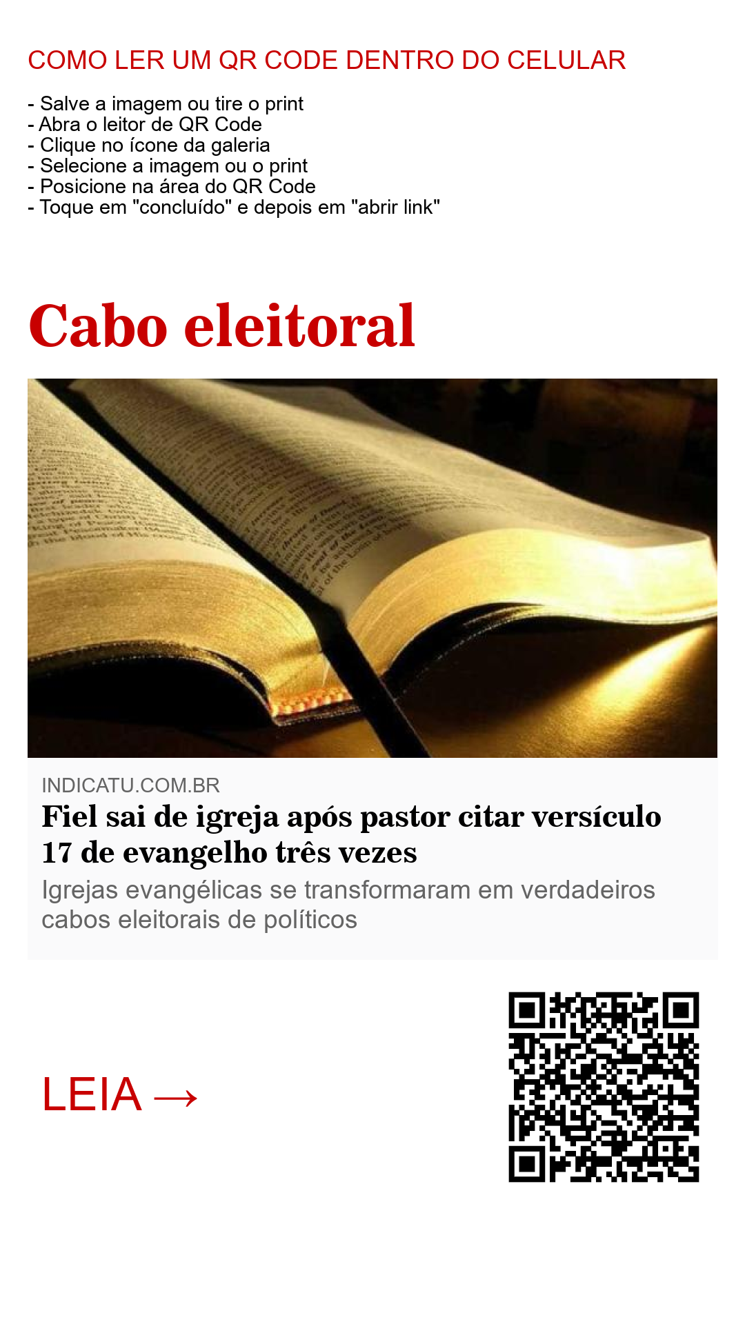 Em uma igreja em Natal no Rio Grande do Norte, uma fiel muito chateada com a postura do pastor, levantou-se e foi embora do culto quando o ministro usou de forma subliminar o versículo de um evangelho para promover, durante a sessão litúrgica, campanha pró-Bolsonaro. “Abram sua bíblia no capítulo tal... O versículo é o 17... Gente, o versículo é o 17 tá bom !?... é o 17 o versículo, pessoal...”