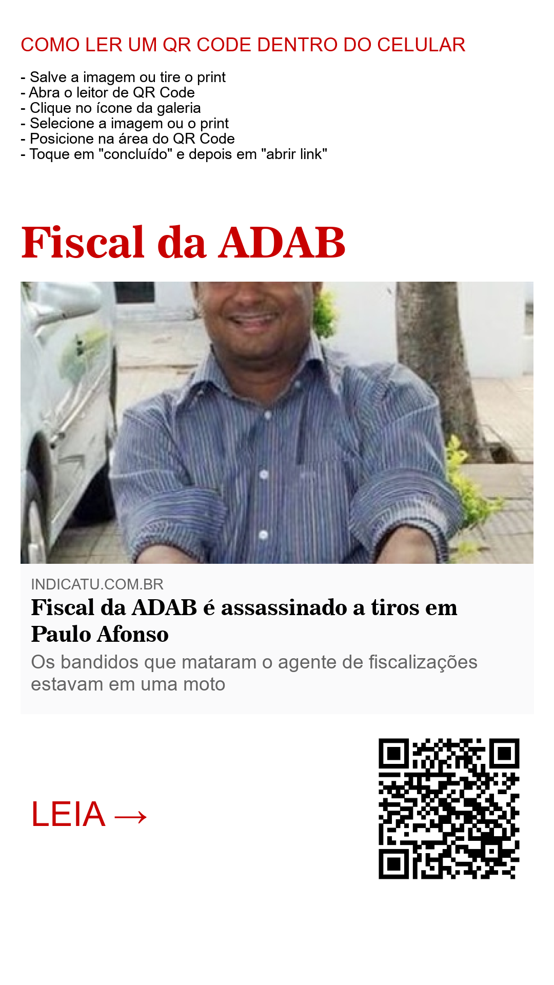 Dois homens a bordo de uma motocicleta, na altura da BR-110 em Paulo Afonso, próximo da divisa com Alagoas, executaram a tiros a Mário Gomes de 41 anos de idade, popularmente conhecido como Marinho, também atuante fiscal da ADAB (Agência de Defesa Agropecuária da Bahia) nesta tarde de quinta-feira (10), na região norte do estado.