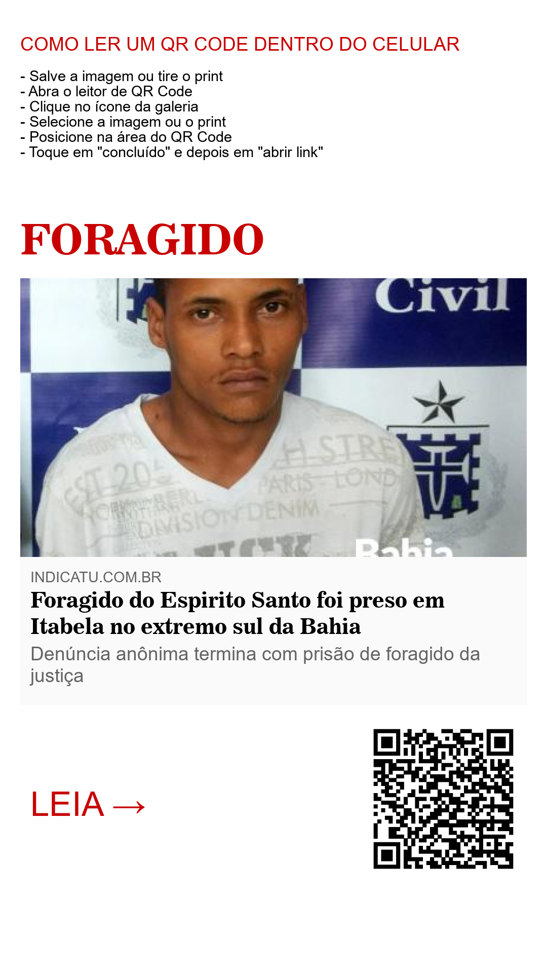 Policiais militares do 4º pelotão de Itabela, juntamente com agentes da polícia civil, prenderam na manhã desta Terça-Feira (18) Antônio Júnior de Jesus Oliveira, foragido, no bairro Bandeirantes, após uma denúncia anônima de tráfico de drogas.