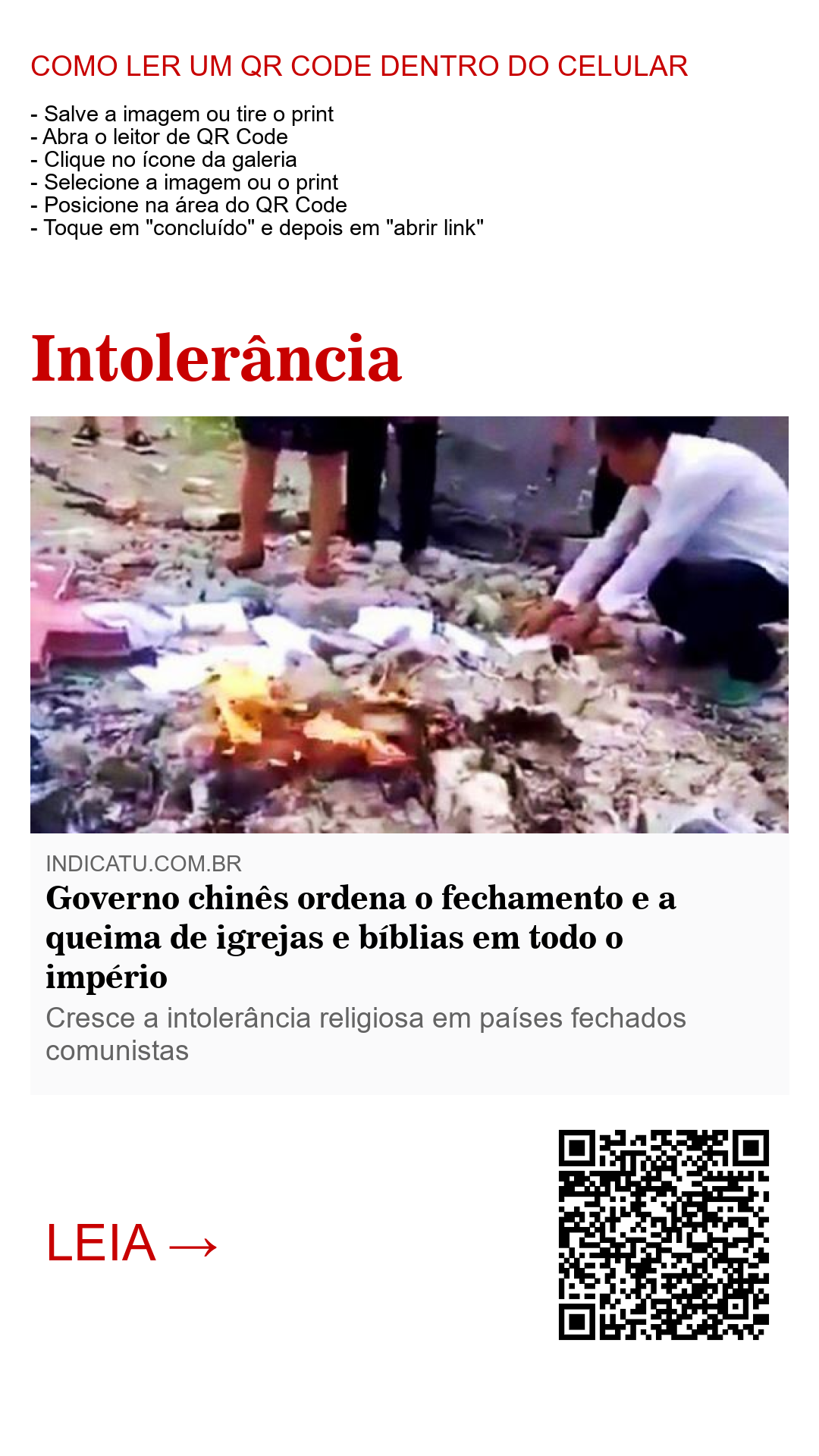 O governo da China ordenou o fechamento de igrejas e a queima de bíblias em todo o império. O propósito da ação é intensificar a repressão às congregações cristãs da capital Pequim e de outras províncias do país. Os atos consistem em destruir cruzes, queimar Bíblias e fechar igrejas. Os fiéis são obrigados também a assinar documentos renunciando sua crença. As informações são da Associated Press (AP).