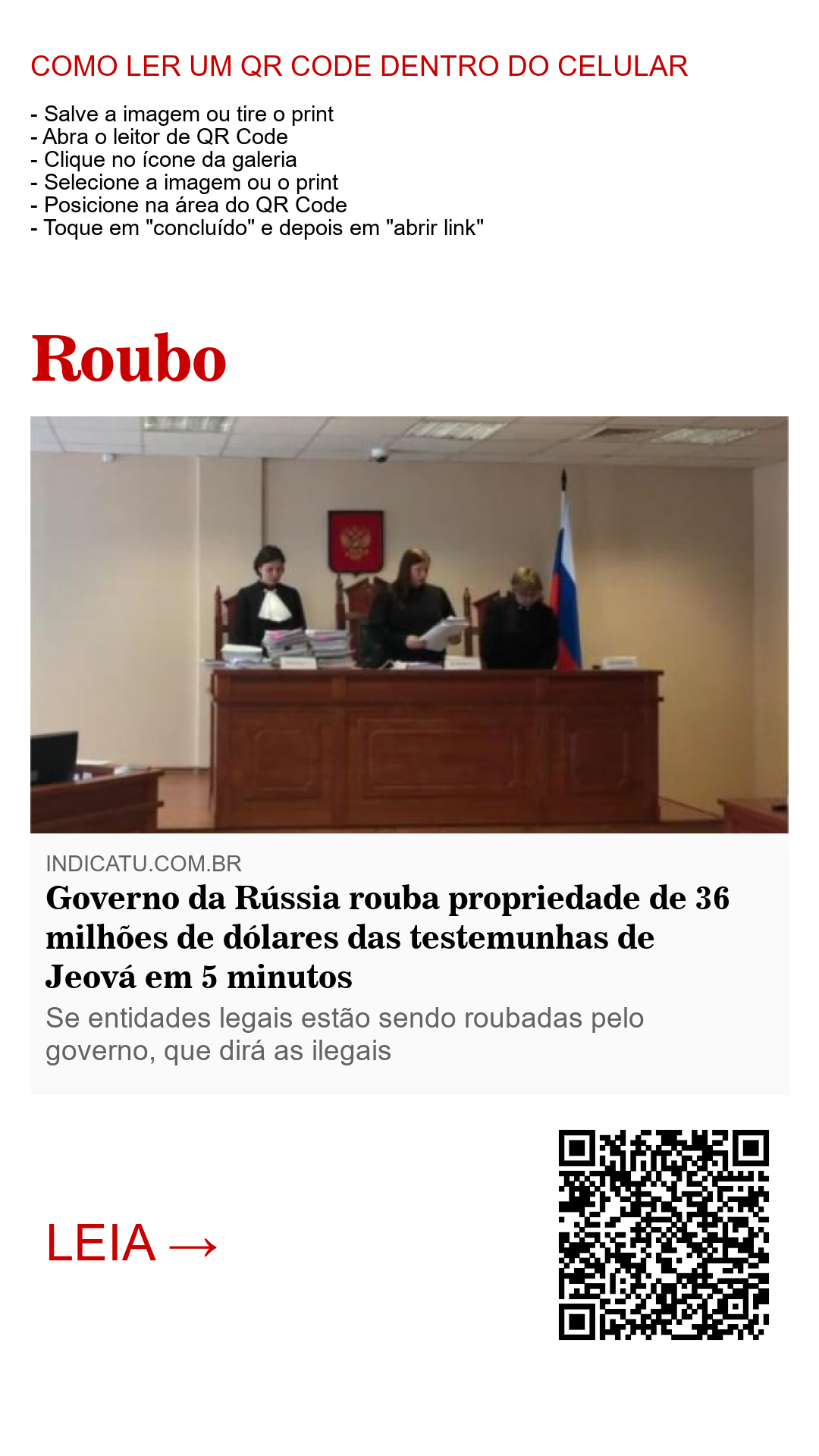 Em apenas 5 minutos, a propriedade sede das testemunhas de Jeová na Rússia, com valor estimado em 2 bilhões de rublos russos, o equivalente a 36 milhões de dólares ou, R$ 118.348,096 reais, foi ‘roubada’, visto que não há outro termo que melhor qualifique o confisco ilegal de uma propriedade particular, 100% quitada e com todos os impostos em dia, por parte de uma decisão judicial pré-julgada e decidida pelo governo com antecedência, transformando a sessão do júri do último dia 03 de Maio em um verdadeiro circo jurídico eivado de vícios.