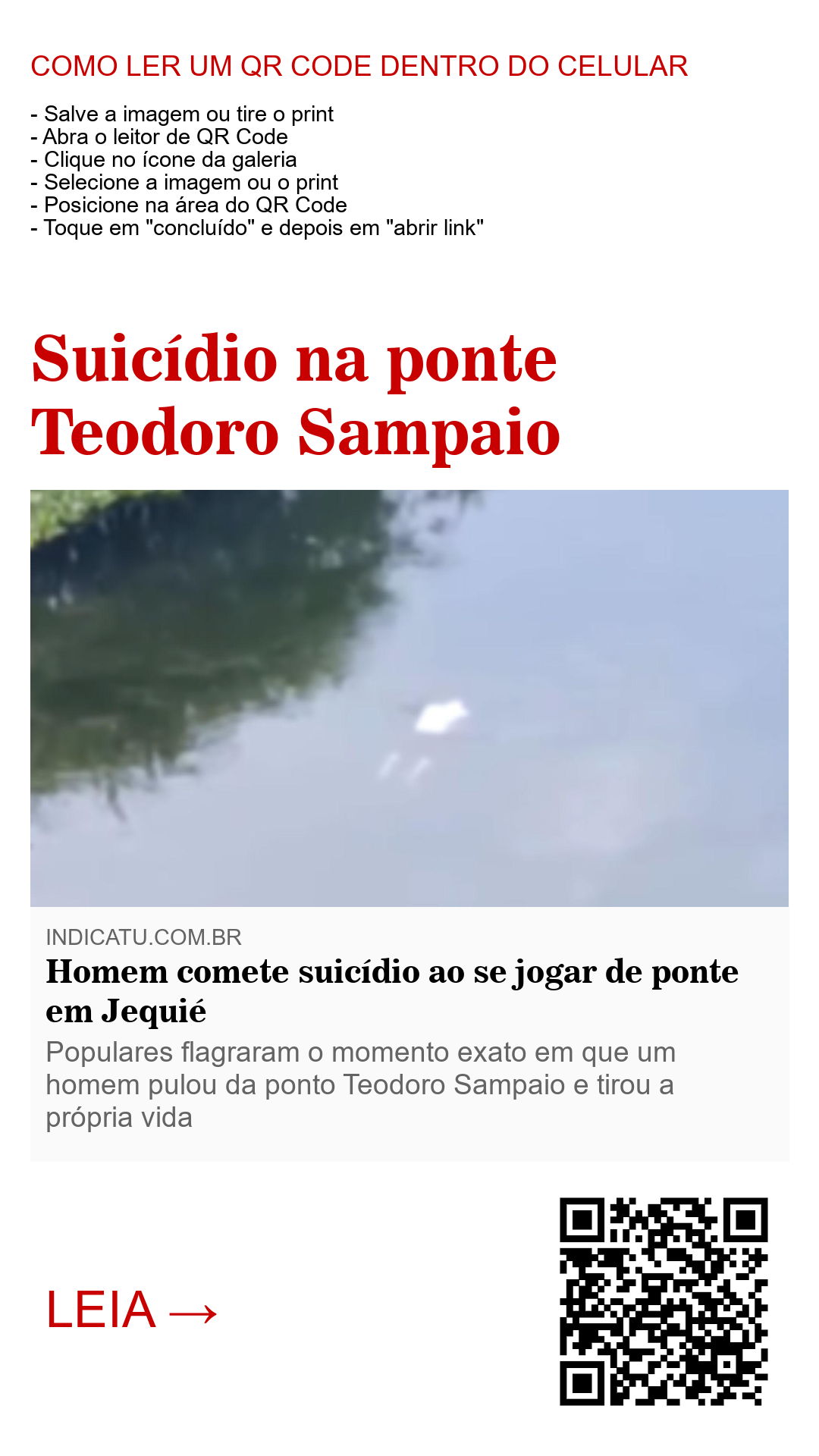 Na manhã desta quarta-feira, 11 de junho de 2025, um homem aparentando cerca de 40 anos tirou a própria vida ao se lançar da ponte Teodoro Sampaio, que liga o centro da cidade ao bairro Mandacaru, em Jequié.