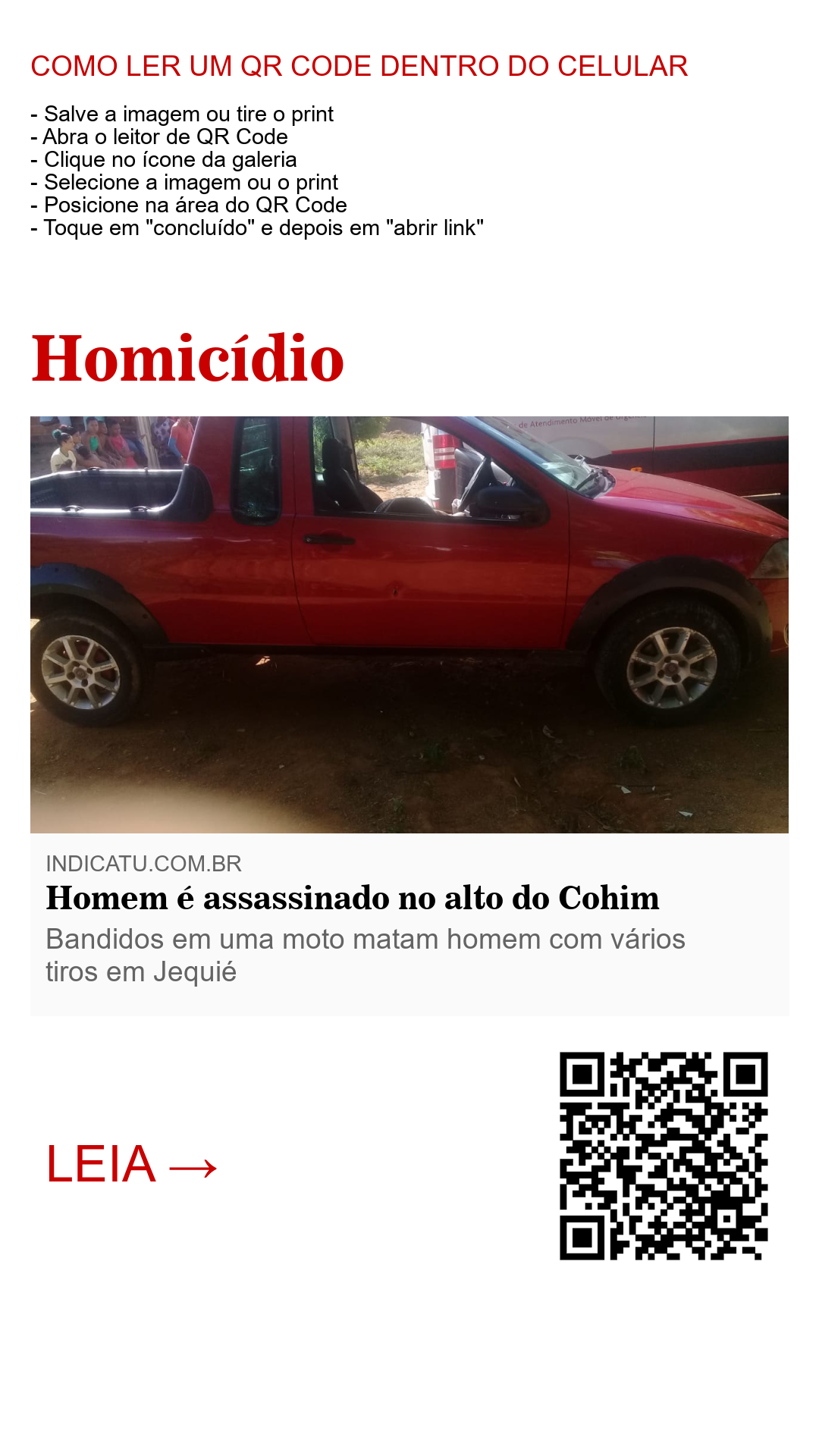Um homem aparentando ter cerca de 30 anos foi friamente assassinado a tiros por volta das 15h30 desta tarde de sexta-feira, 20, na rua Rubens Xavier, final do Loteamento Sol Nascente (alto do Cohim) nas imediações do bairro Pedreira, em Jequié. Segundo informações, a vítima conduzia seu veículo Fiat Strada de cor vermelha quando foi perseguido por dois criminosos a bordo de uma moto. Os assassinos interceptaram o veículo e efetuaram vários disparos de arma de fogo contra o alvo dentro do carro. O homem, de prenome Edson, vugo Edy, não resistiu aos ferimentos e morreu no local.