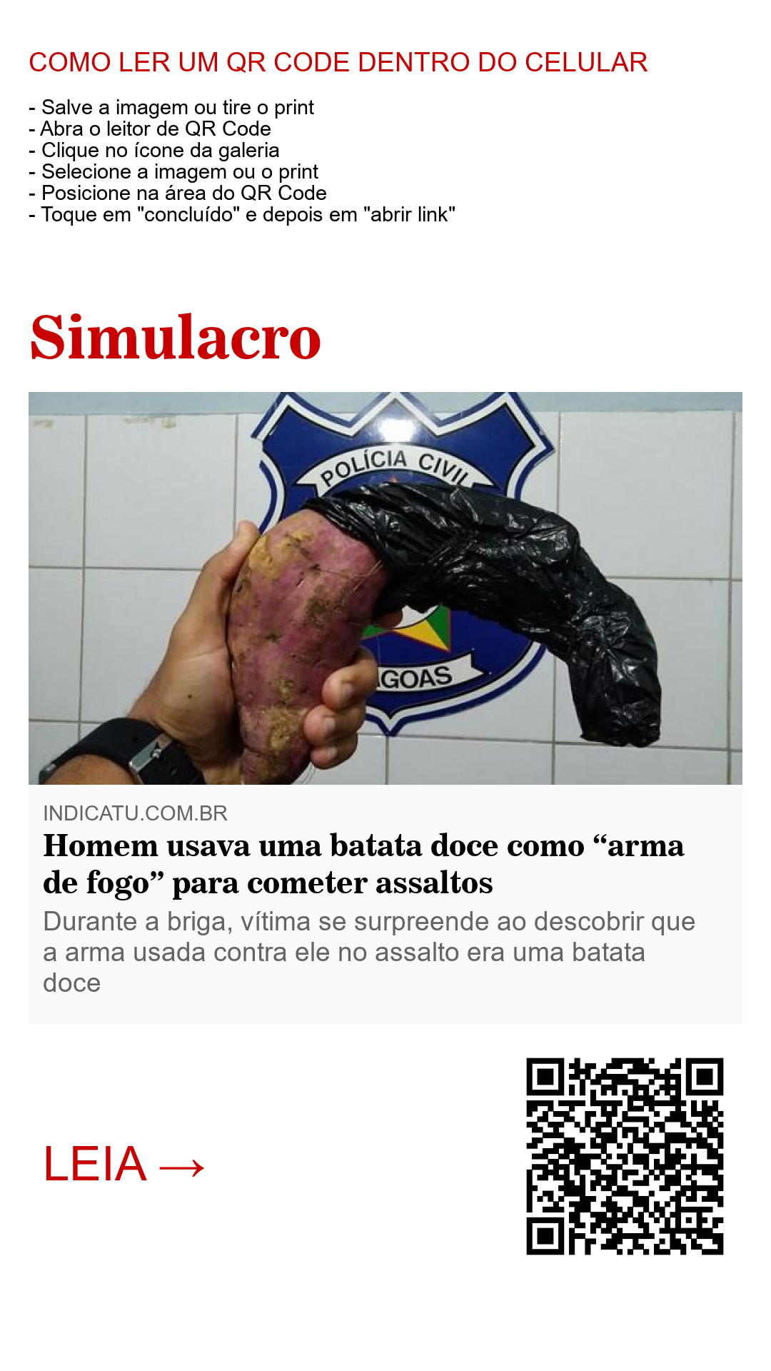 Chegou ao fim a saga do indivíduo que usava uma batata doce revestida em um saco plástico preto para simular uma arma de fogo, render e assaltar as vítimas em Maceió, no bairro Benedito Bentes. A vítima da ação criminosa foi um motociclista que tinha sido abordado pelo meliante e obrigado a conduzir a motocicleta até um matagal. Chegando lá, o criminoso Samuel Lira Rodrigues de 29 anos começou a espancar a vítima com uma barra de ferro, que desconfiou da ação, criou coragem e entrou em luta corporal com o mesmo até conseguir dar-lhe uma ‘chave de braço’ e imobiliza-lo.