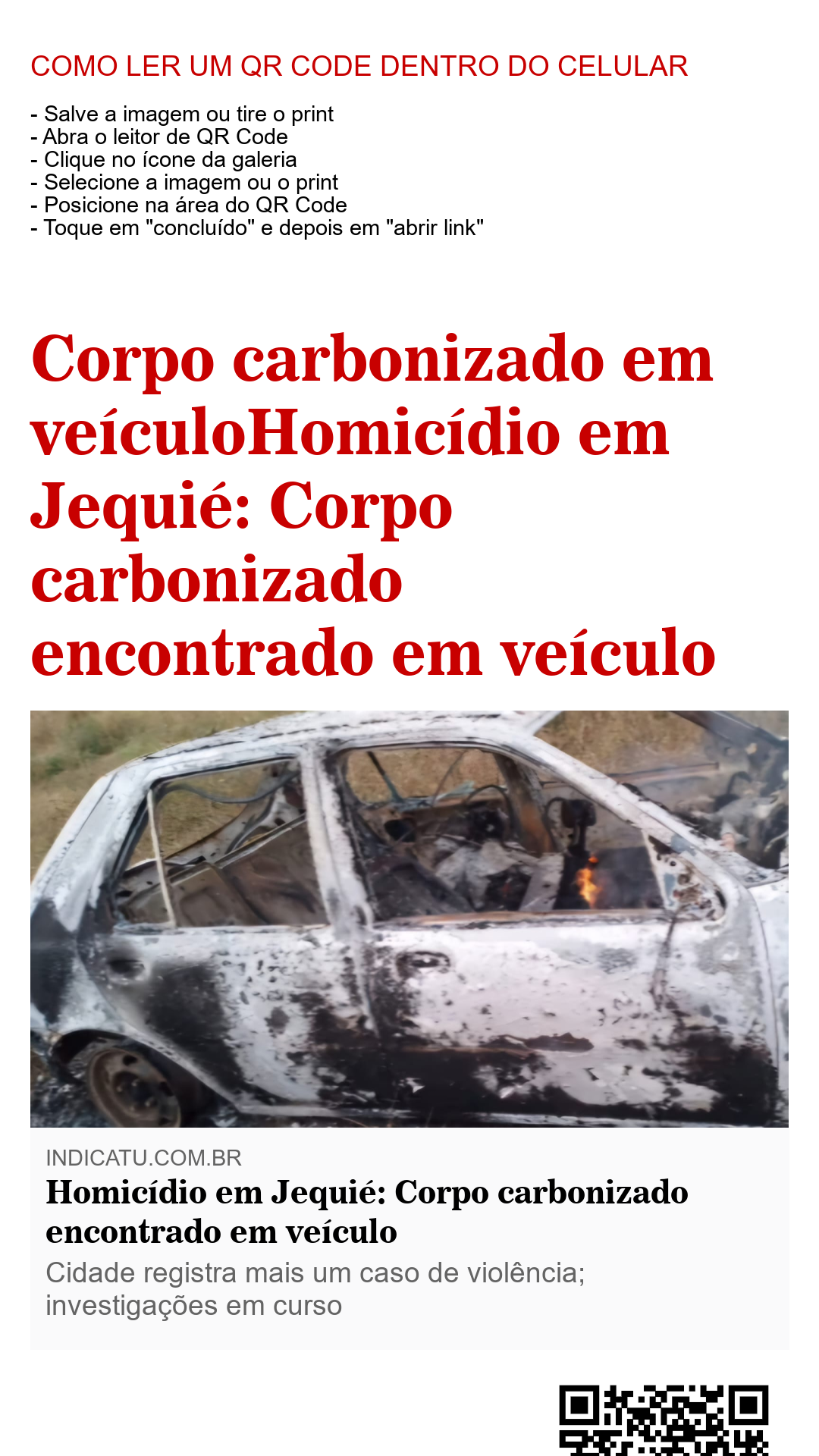 Mais um homicídio foi registrado em Jequié hoje, 14 de outubro de 2024. Um corpo foi encontrado carbonizado dentro de um veículo Fiesta, na região do Lixão, na saída sentido Salvador. Este incidente ocorre em um contexto alarmante, uma vez que a cidade tem enfrentado um aumento significativo nos índices de homicídios nos últimos dias. As informações ainda dão conta de que um jovem de 19 anos também morreu em confronto com policiais no fim da madrugada de hoje.