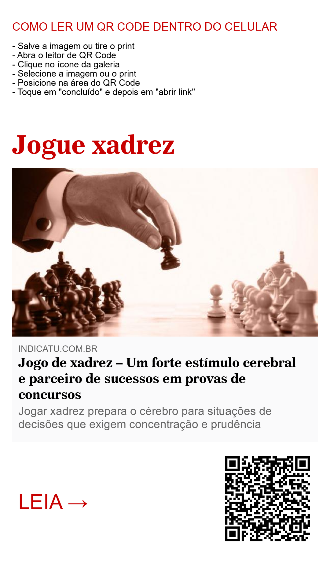 A experiência é fascinante e torna o cérebro menos preguiçoso. Notará uma grande diferença em seu poder de concentração logo após algumas partidas. Jogar xadrez não é só um hobby. É divertido, inteligente, trabalha a mente e enriquece o conhecimento.