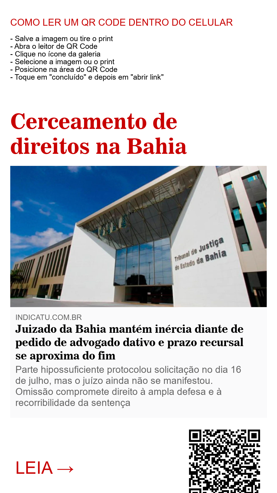 Diante da omissão do juízo, a situação foi submetida à Corregedoria-Geral da Justiça da Bahia. A comunicação ocorreu por meio eletrônico e incluiu petição específica reiterando o pedido de defensor dativo e solicitando a suspensão do prazo recursal, além de apontar o risco de perecimento de direito.
