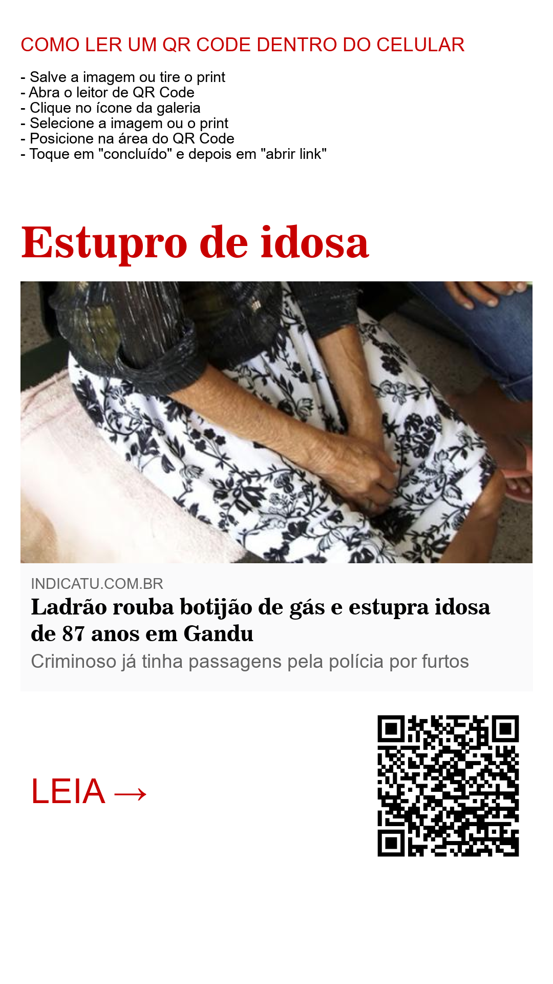 De acordo com a polícia civil à jornais da região, a idosa, que mora sozinha, acordou com barulhos na sua cozinha quando, ao sair para verificar o que se passava, foi surpreendida pelo elemento que usou de força maior e a violentou. O indivíduo fugiu em seguida levando um botijão de gás e deixando a idosa de rosto e mãos machucadas, que lutava para se livrar do monstro.