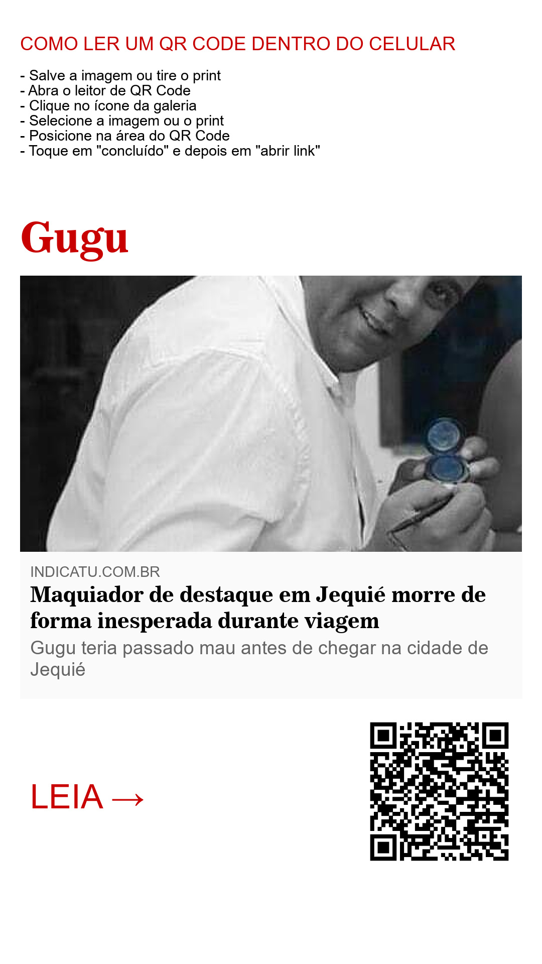 Seguem as informações de que o renomado maquiador da socialite de Jequié, vulgarmente conhecido como Gugu, morreu após sofrer um ataque fulminante enquanto retornava para sua cidade natal, Jequié, dentro de um ônibus da viação Camurujipe.