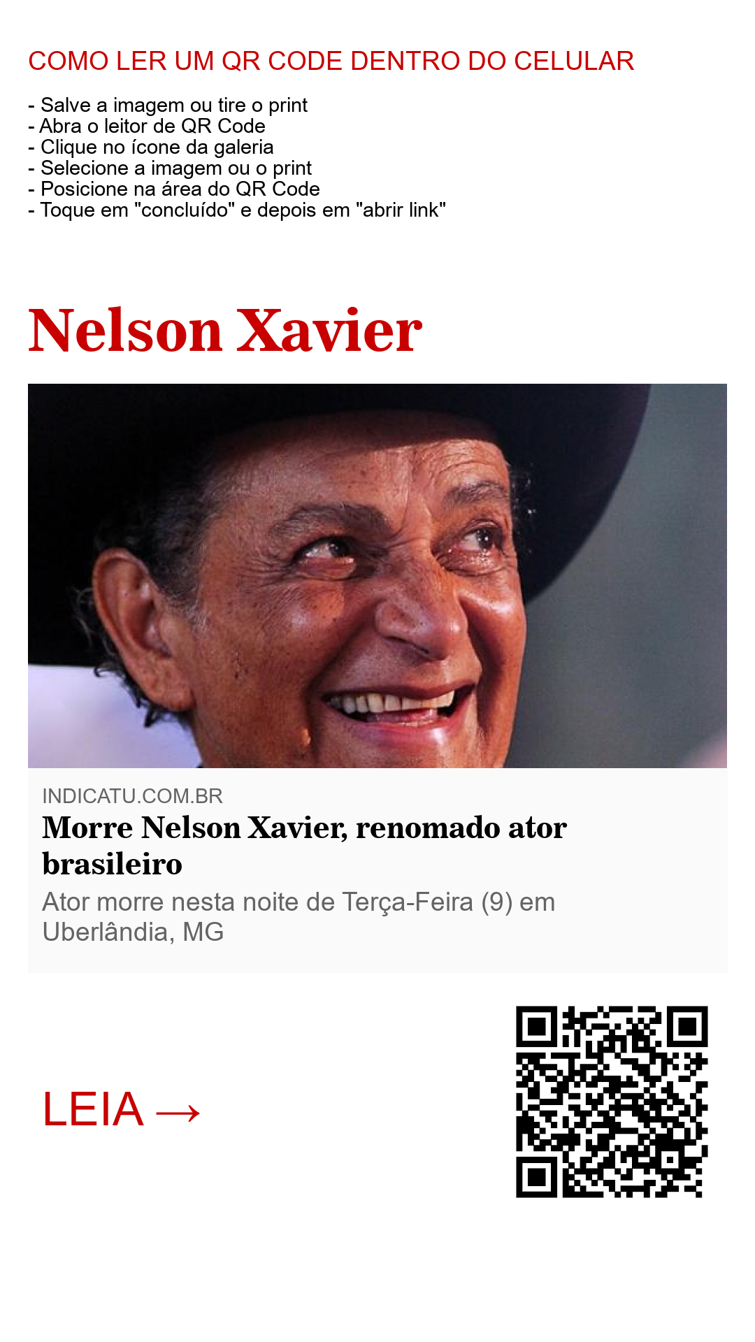 Nascido em 30 de Agosto de 1941 no estado de São Paulo, Nelson Xavier descansa aos 75 anos de idade, na noite da última Terça-Feira(9), na cidade de Uberlândia, Minas Gerais.