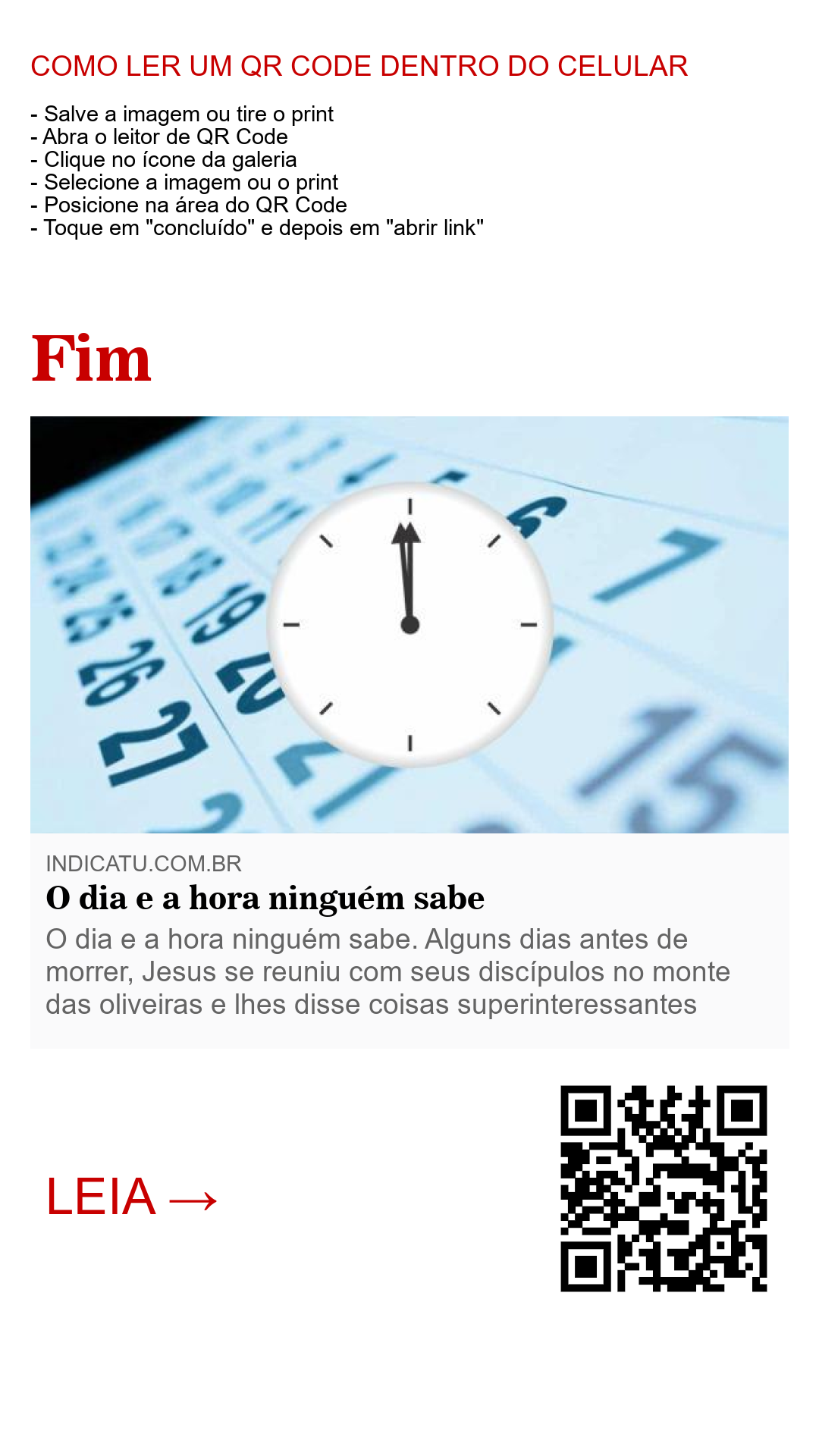 O dia e a hora ninguém sabe. Alguns dias antes de morrer, Jesus se reuniu com seus discípulos no monte das oliveiras e lhes disse coisas superinteressantes que marcariam o fim de dois sistemas de coisas, sendo um deles o sistema de coisas judaico, e o outro o sistema de coisas mundial. Ele detalhou o desenrolar dos eventos fornecendo sinais que identificariam a proximidade do tempo em que tudo aconteceria, mas fez questão de frisar que ninguém saberia o dia e a hora do “clímax” desses eventos.