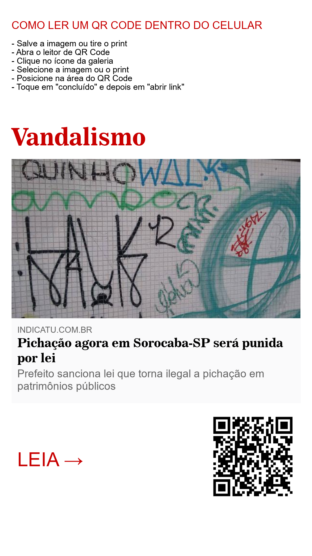 Foi sancionada pelo prefeito de Sorocaba, José Crespo do DEM, a lei que torna ilegal os atos de pichação em patrimônios públicos e privados. A lei que já existia em norma municipal que condena atos de depredação, vandalismo e pichação, agora terão uma abrangência mais ampla. As multas para os infratores será de R$ 1.000,00 sendo que esse valor será em dobro para aqueles pegos em reincidência.