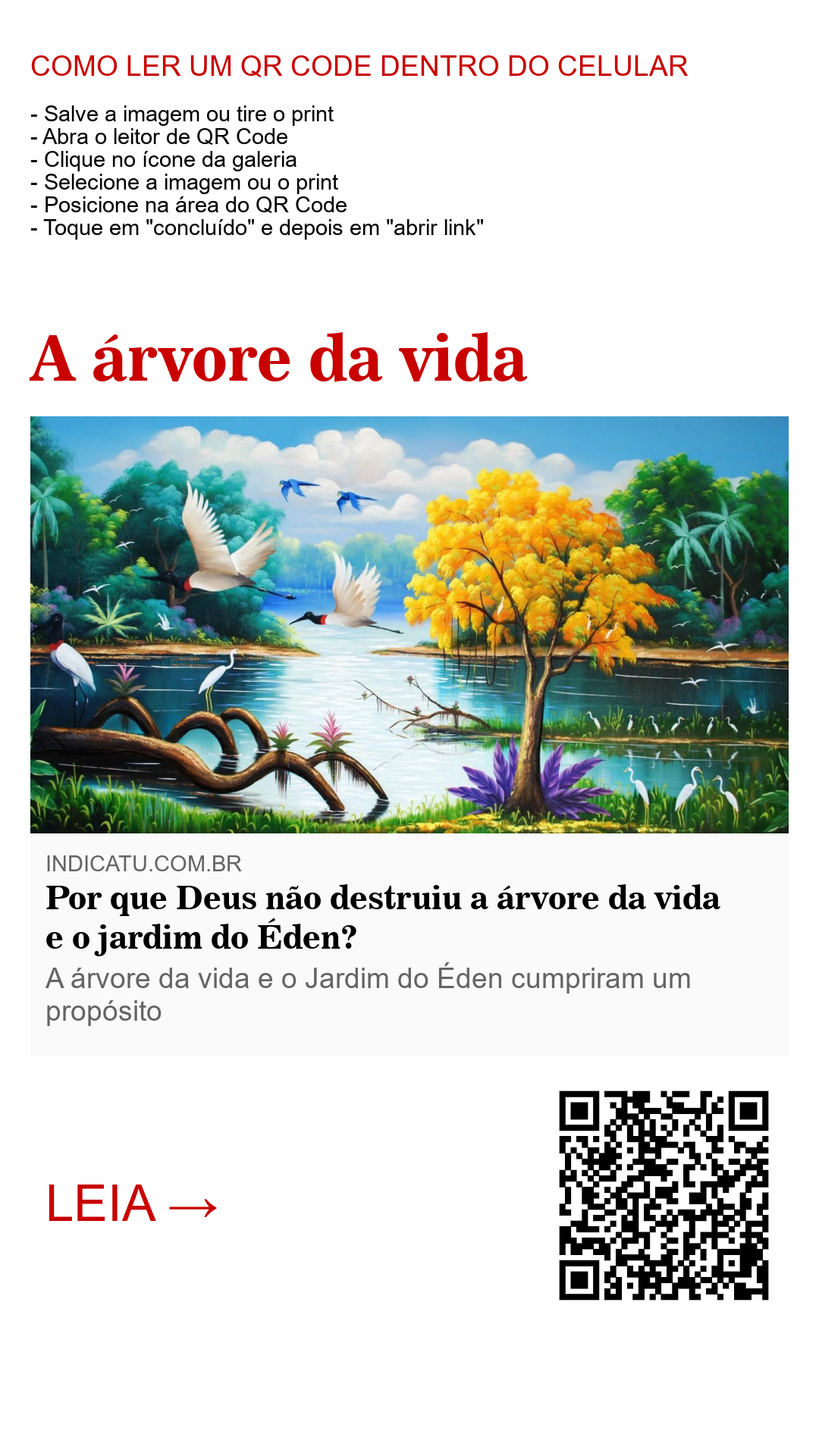 Mas o Éden e sua árvore da vida não permaneceram para sempre. Eles cumpriram o propósito divino até séculos depois da morte de Adão e Eva para só então sumirem da vista de gerações quase milenares, a descendência rebelde de Adão e Eva varrida no Dilúvio. Pode-se dizer, assim, que, em meio a uma geração rebelde, a árvore da vida foi a primeira testemunha de Jeová da história. Ela foi mantida e preservada ali para transmitir uma mensagem: a esperança de vida eterna dada por Deus!