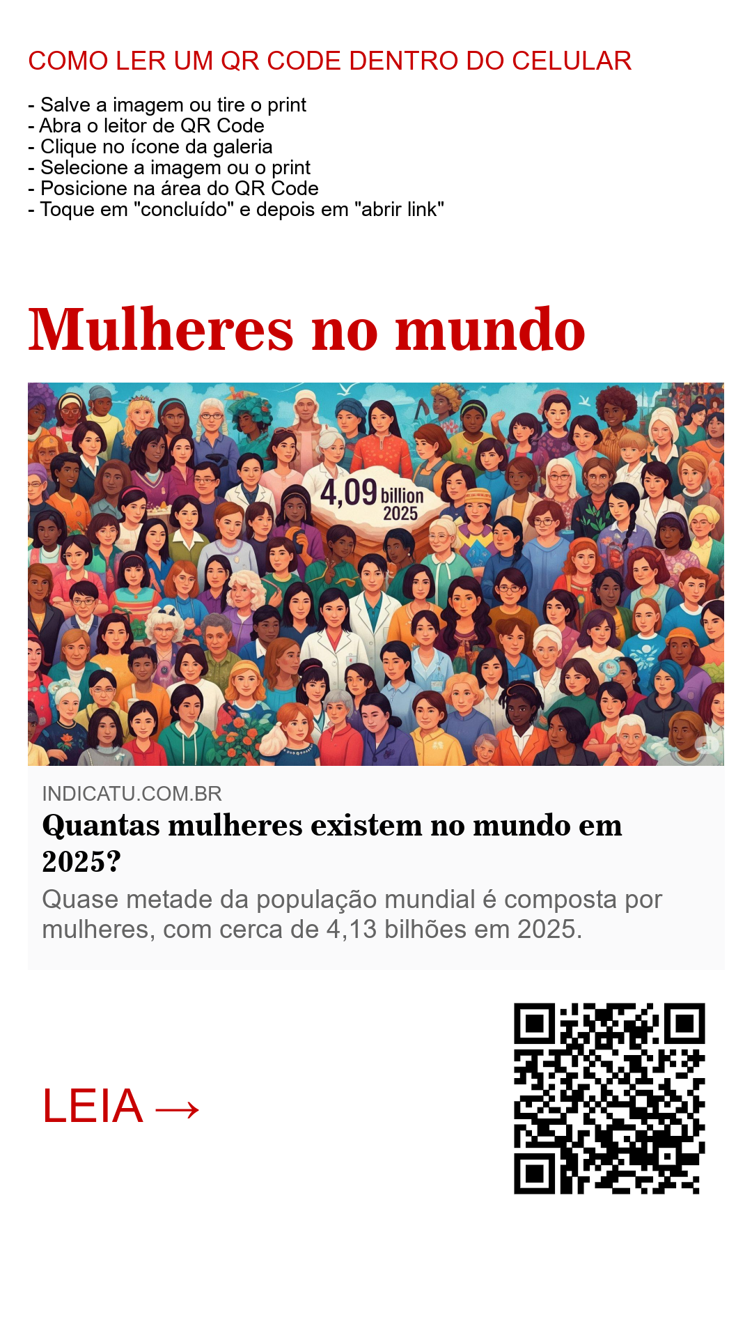 Em 2025, a população mundial é estimada em aproximadamente 8,29 bilhões de pessoas. Segundo dados da ONU e do Banco Mundial, cerca de 49,8% dessa população são mulheres, o que representa aproximadamente 4,13 bilhões de mulheres ao redor do mundo.