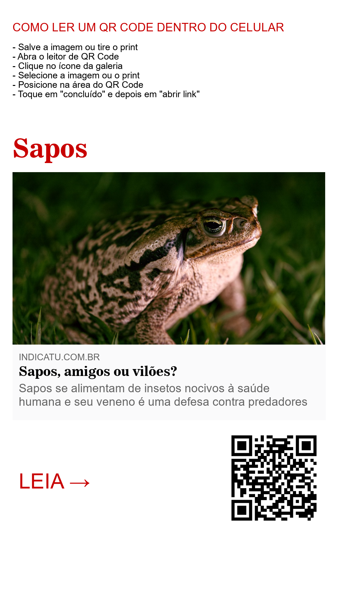 Portanto, quando você vir um sapo pulando por aí ou dentro de sua casa, não se apavore. Se não quiser brincar com ele, não o maltrate e nem jogue sal nele. Apenas ponha-o para fora de casa ou faça-o ir embora. Afinal, ele está ali à procura de “alimentos” que te fazem mal. Mas caso queira segura-lo na mão, não aperte suas glândulas, pois o veneno pode sim, se atingido na boca ou nos olhos, causar sérios danos à sua saúde. Fora isso, os sapos são figuras sensacionais.
