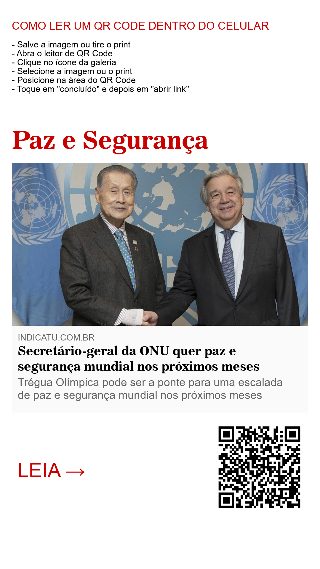 A “trégua olímpica tradicional”, como é chamado o “silenciar das armas durante os jogos olímpicos”, foi usada por Guterres como “ponte” para um sessar fogo duradouro nos próximos meses, e além. “povos e nações podem aproveitar esta pausa temporária nos confrontos e assim estabelecer cessar-fogos duradouros e encontrar caminhos para a paz sustentável”, disse Guterres.