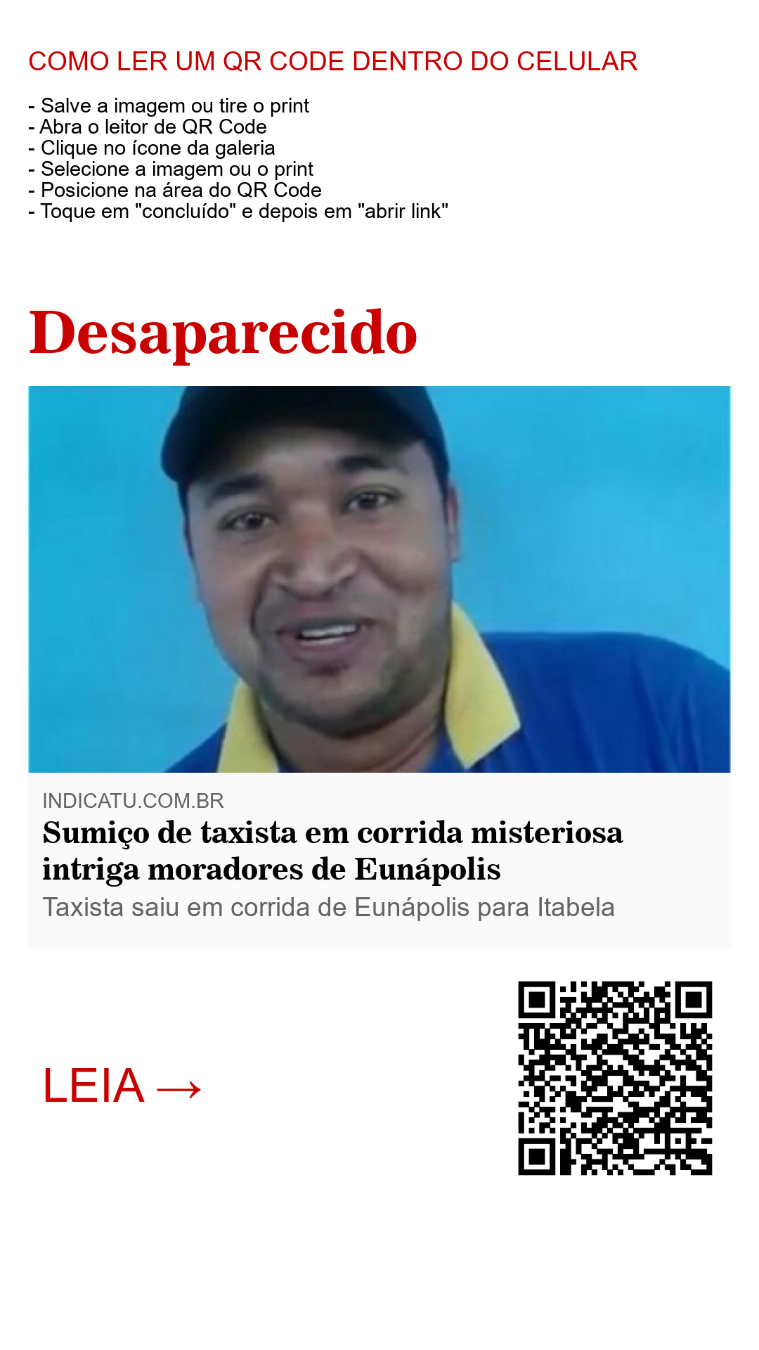 Albérico Silva Santos, popular "Ligeirinho" saiu em corrida de Eunápolis para Itabela, extremo sul baiano, e não retornou. Segundo fontes locais, a esposa de Albérico relatou que ele recebeu uma ligação na Terça-Feira (22) às 21:00h para levar três pessoas em Itabela.