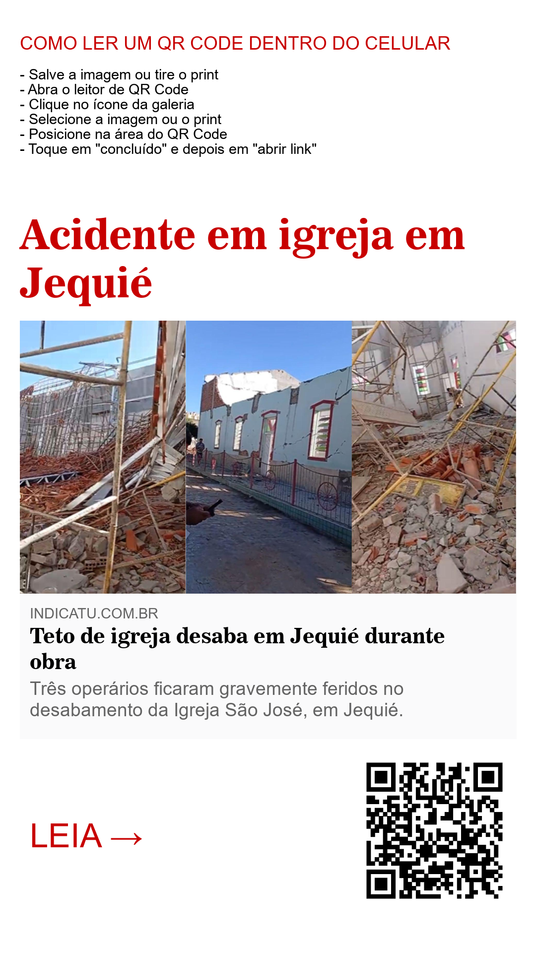 O teto da Igreja São José desabou em Jequié, no bairro São Judas Tadeu, na manhã desta terça-feira (10), deixando três trabalhadores gravemente feridos. O acidente ocorreu durante uma obra de reforma na tradicional igreja católica, considerada uma das mais bonitas da cidade. No momento do desabamento, 14 pessoas estavam no local — algumas ficaram sob os escombros. Segundo relatos, os operários utilizavam Equipamentos de Proteção Individual (EPI) e a obra é regularizada.