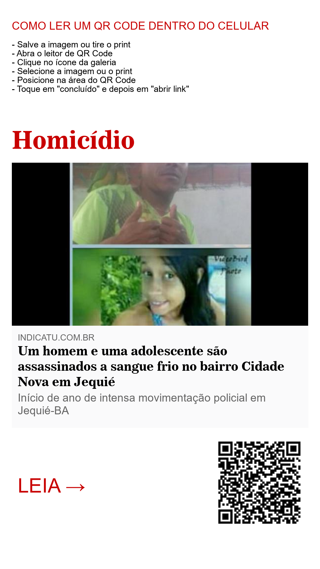Segue as informações de que dois jovens foram friamente assassinados nesta tarde de terça-feira (02), por volta das 14:30h, no bairro Cidade Nova em Jequié. As vítimas foram identificadas como Evandro Silva dos Santos, vulgo jacu, de 34 anos, e Kelly Ferreira Barreto, de 16 anos.