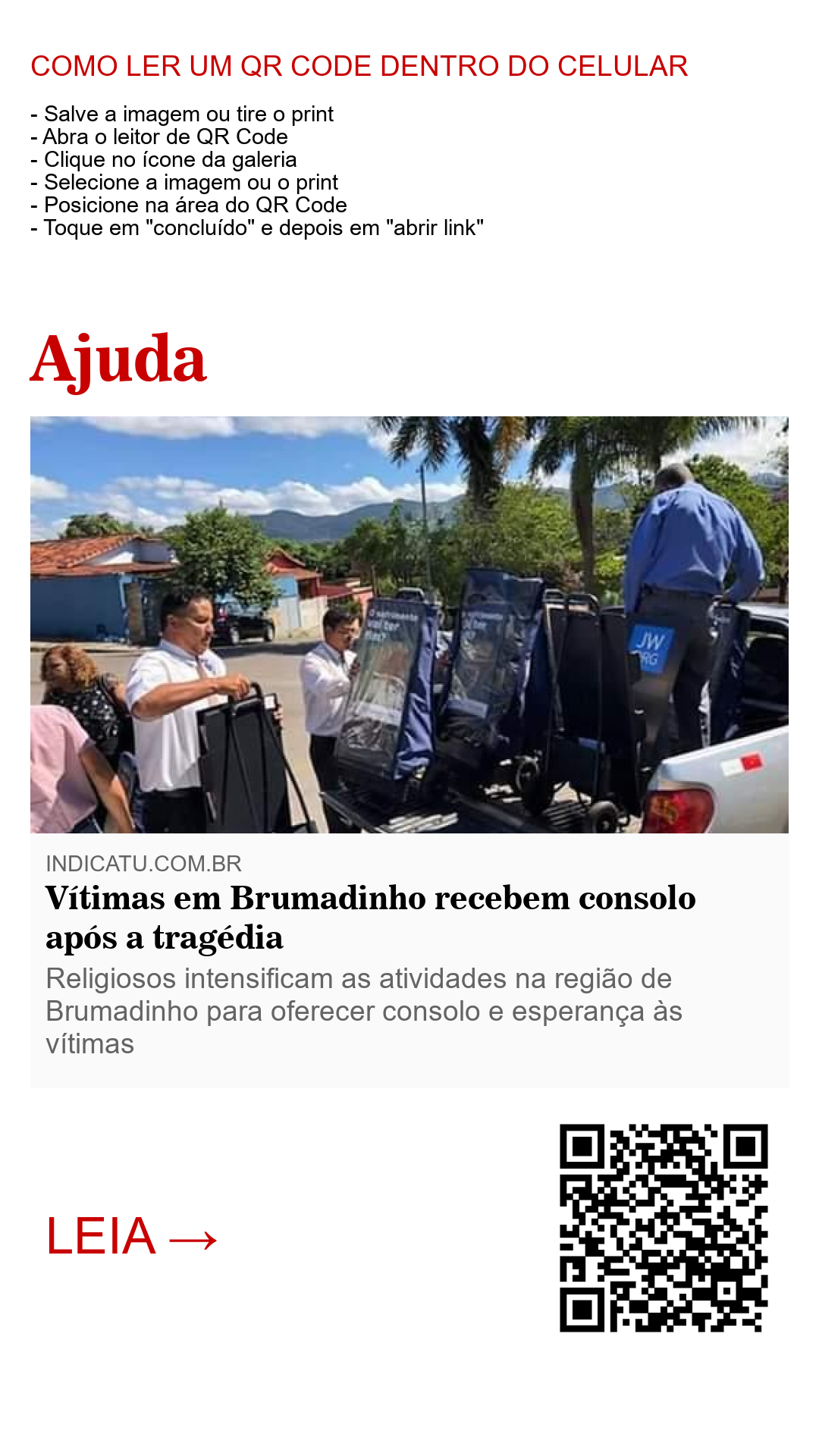 As vítimas do crime ambiental em Brumadinho, cidade do estado de Minas Gerais no Brasil que ficou mundialmente conhecida após o rompimento de uma barragem de rejeitos de minério, estão recebendo mensagens de consolo e esperança de modo maciço do primeiro grupo religioso a chegar até o local afetado. Vários religiosos do grupo testemunhas de Jeová se deslocam a todo instante para a região da tragédia com carrinhos de publicações contendo assuntos variados que focam no consolo emocional de pessoas vítimas de tragédias e outras situações de crise que afetam a saúde psicoemocional de quem teve a tristeza de ter sua rotina interrompida pelas incertezas da vida, ou, como é o caso em Brumadinho, pela falta de responsabilidade e critério dos responsáveis pelo empreendimento de alto risco que custou, até agora, as vidas de mais de 100 brasileiros.